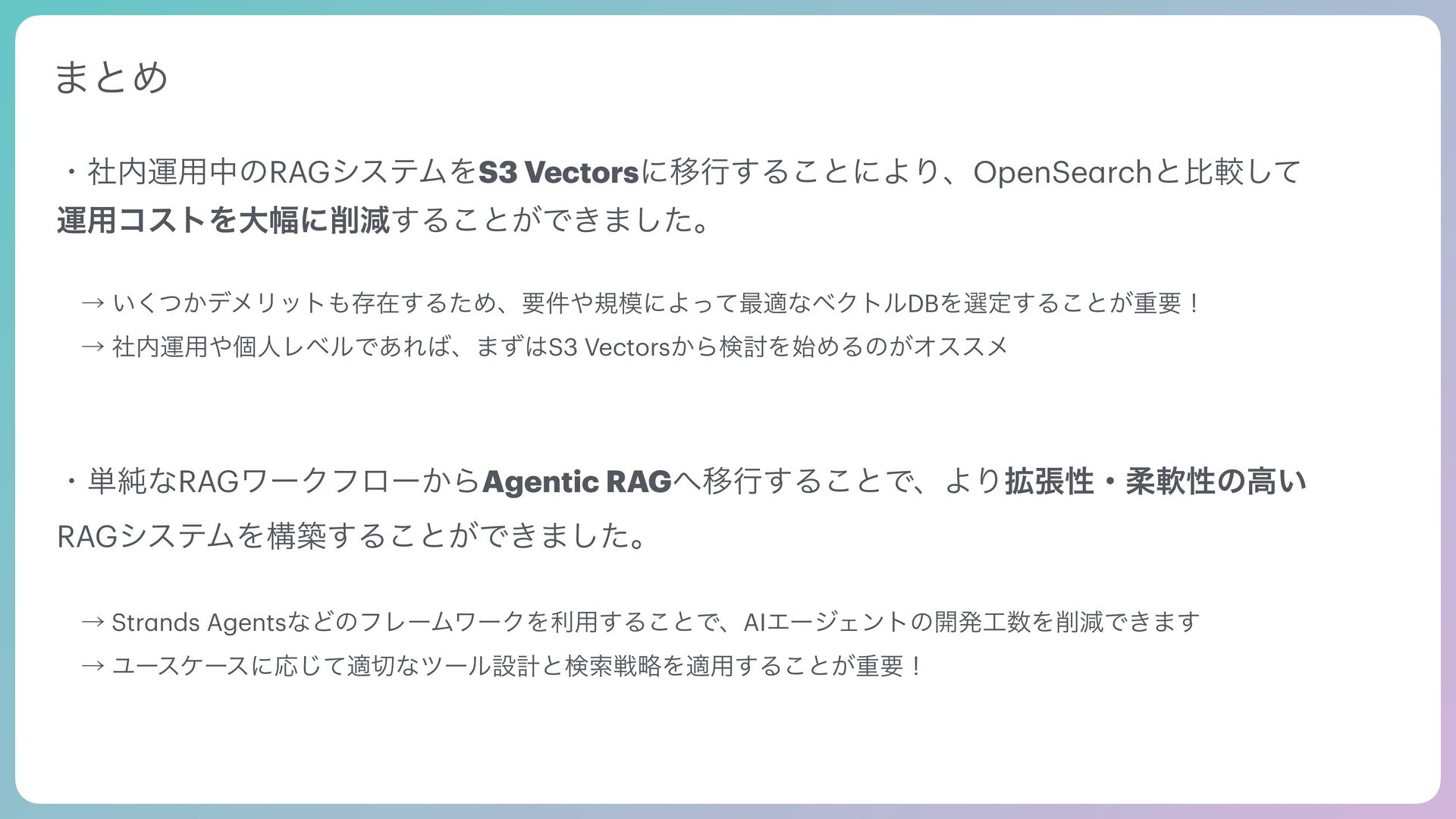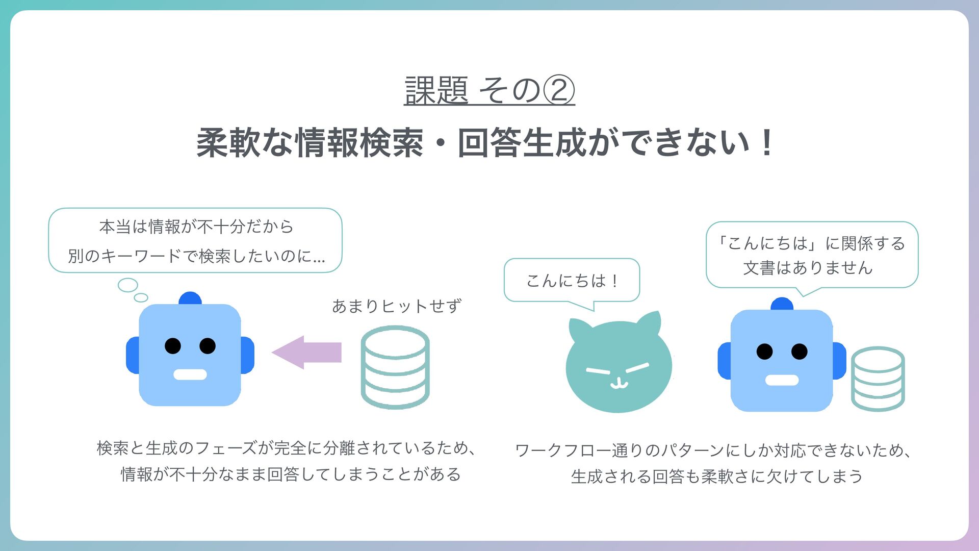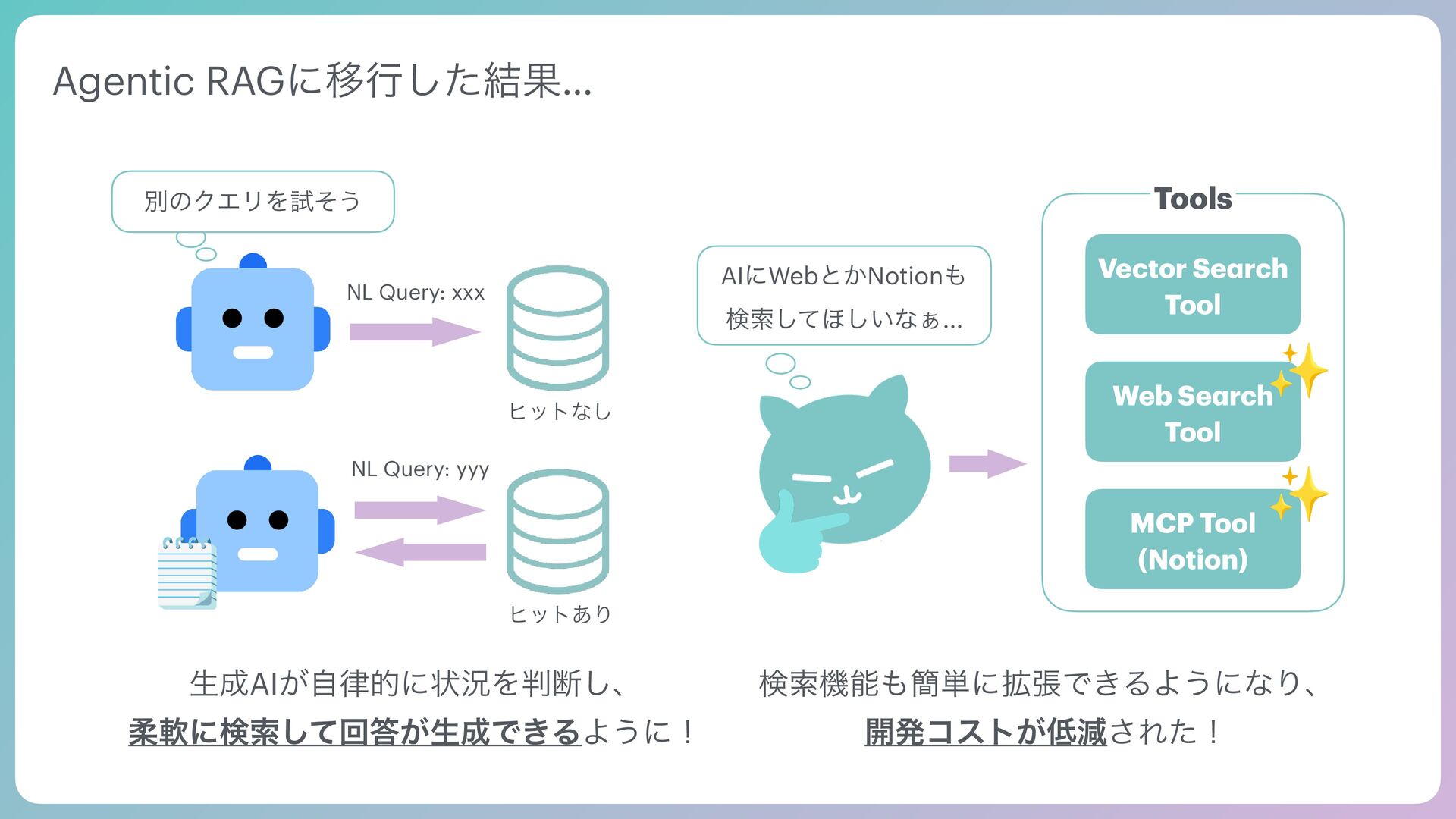 Se a rch Tool Web Se a rch Tool MCP Tool (Notion) AIʹWebͱ͔Notion ݕࡧͯ͠΄͍͠ͳ͊... ώοτ͋Γ Agentic RAGʹҠߦͨ݁͠Ռ… ੜAI͕ࣗతʹঢ়گΛஅ͠ɺ ॊೈʹݕࡧͯ͠ճ͕ੜͰ͖ΔΑ͏ʹʂ ݕࡧػೳ؆୯ʹ֦ுͰ͖ΔΑ͏ʹͳΓɺ ։ൃίετ͕ݮ͞Εͨʂ