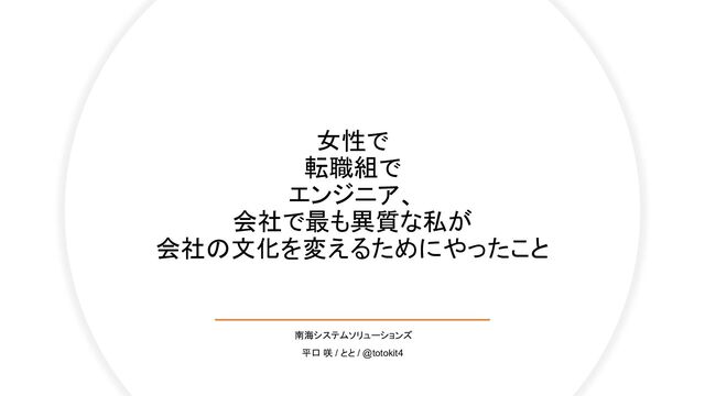 女性で 転職組で エンジニア、 会社で最も異質な私が 会社の文化を変えるためにやったこと 南海システムソリューションズ 平口 咲 / とと
