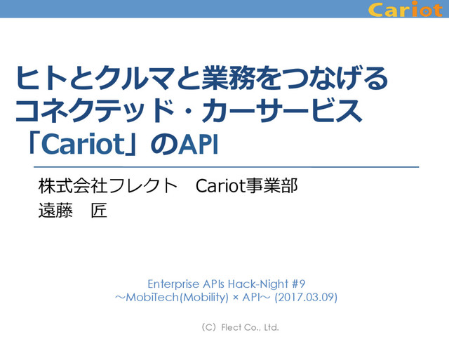 (C)Flect Co., Ltd. ヒトとクルマと業務をつなげる コネクテッド・カーサービス 「Cariot」のAPI 株式会社フレクト Cariot事業部 遠藤 匠 Enterprise APIs