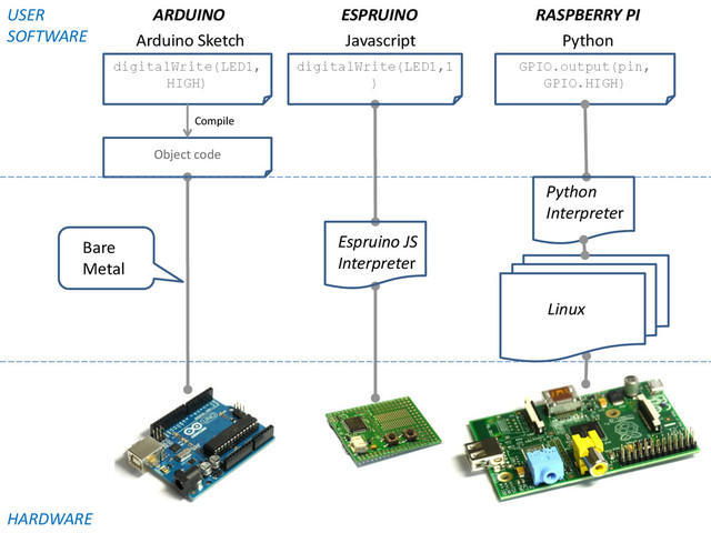 Bare Metal Espruino JS Interpreter Python Interpreter Arduino Sketch digitalWrite(LED1,1 ) Javascript Python Compile ARDUINO ESPRUINO RASPBERRY PI