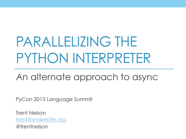 multiple threads to run CPython internals concurrently • True “asynchronicity” • Leverage the parallel facilities above to expose a “truly asynchronous” async API to Python code • (Allow Python code to run concurrently within the same interpreter) • I’ve had a vague idea for how to go about the parallel aspect for a while • The async discussions on python-ideas last year provided the motivation to try and tie both things together • Also figured it would be a great pet project to better familiarize myself with CPython internals
