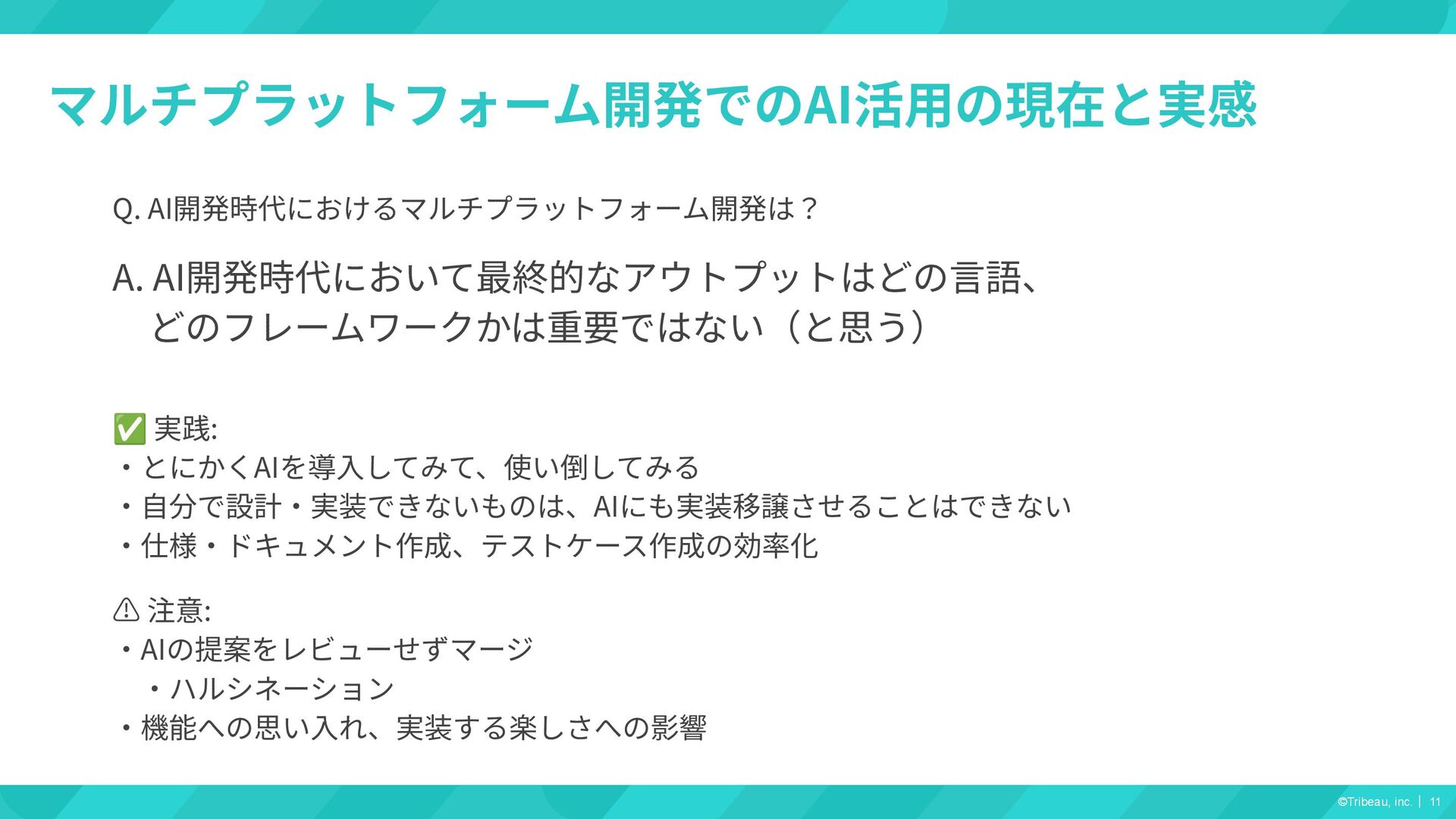 マルチプラットフォーム開発でのAI活⽤の現在と実感 ©Tribeau, inc.| 11 Q. AI開発時代におけるマルチプラットフォーム開発は? A. AI開発時代において最終的なアウトプットはどの⾔語、 どのフレームワークかは重要ではない(と思う) ✅