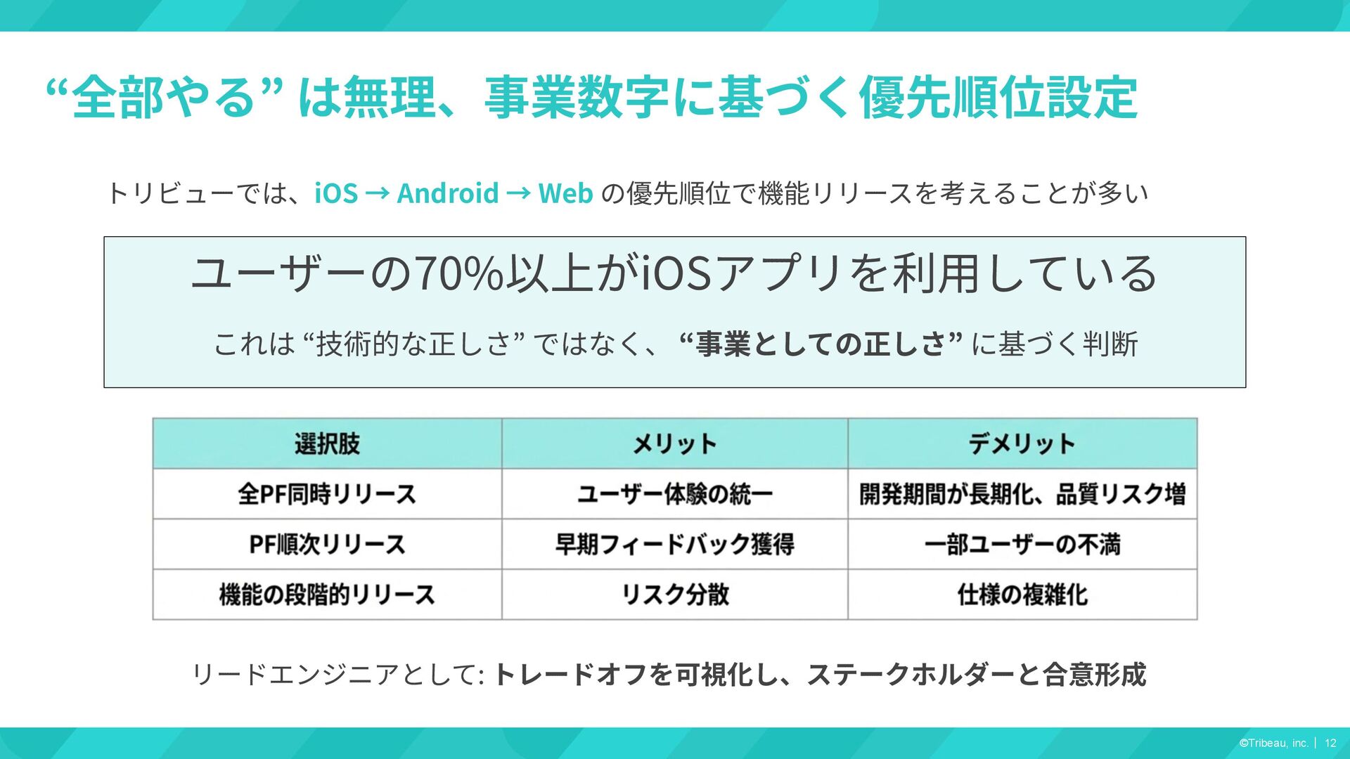 の優先順位で機能リリースを考えることが多い ユーザーの70%以上がiOSアプリを利⽤している これは “技術的な正しさ” ではなく、 “事業としての正しさ” に基づく判断 リードエンジニアとして: トレードオフを可視化し、ステークホルダーと合意形成
