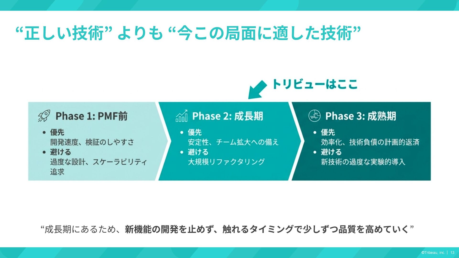 “正しい技術” よりも “今この局⾯に適した技術” ©Tribeau, inc.| 13 “成⻑期にあるため、新機能の開発を⽌めず、触れるタイミングで少しずつ品質を⾼めていく”