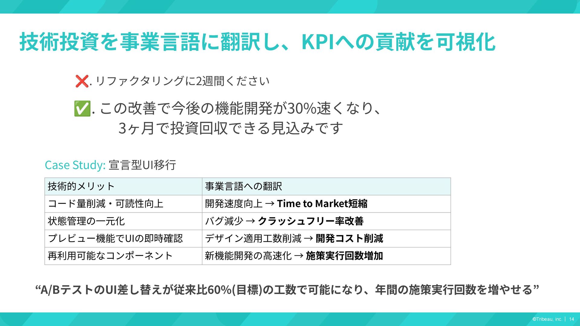 技術投資を事業⾔語に翻訳し、KPIへの貢献を可視化 ©Tribeau, inc.| 14 ❌. リファクタリングに2週間ください ✅. この改善で今後の機能開発が30%速くなり、 3ヶ⽉で投資回収できる⾒込みです Case