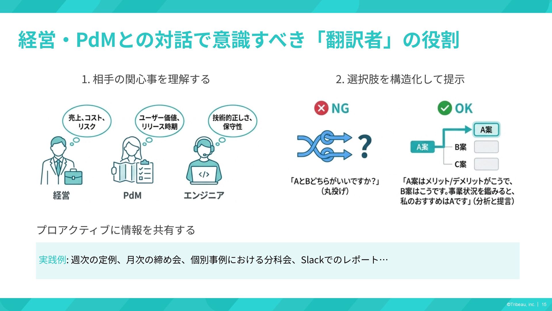 経営‧PdMとの対話で意識すべき「翻訳者」の役割 ©Tribeau, inc.| 15 1. 相⼿の関⼼事を理解する 2. 選択肢を構造化して提⽰ プロアクティブに情報を共有する 実践例: