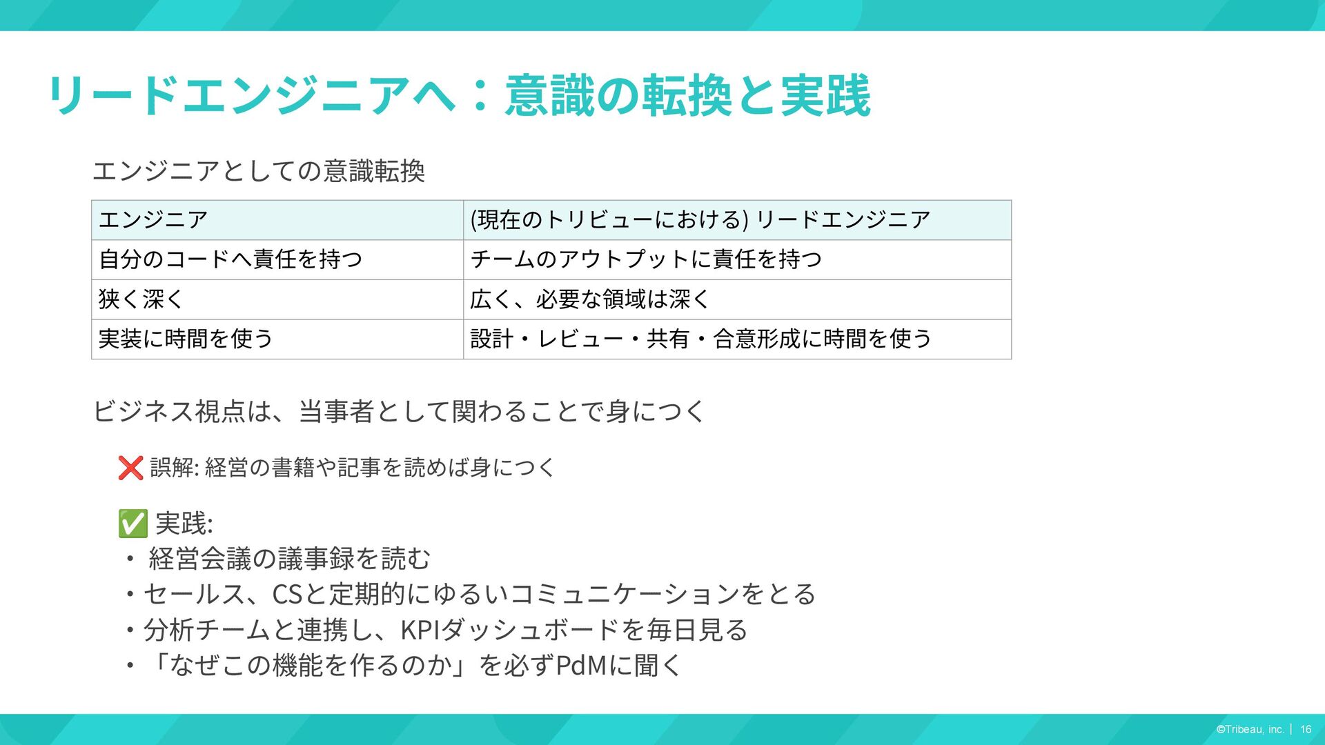 広く、必要な領域は深く 実装に時間を使う 設計‧レビュー‧共有‧合意形成に時間を使う エンジニアとしての意識転換 ビジネス視点は、当事者として関わることで⾝につく ❌ 誤解: 経営の書籍や記事を読めば⾝につく ✅ 実践: ‧ 経営会議の議事録を読む ‧セールス、CSと定期的にゆるいコミュニケーションをとる ‧分析チームと連携し、KPIダッシュボードを毎⽇⾒る ‧「なぜこの機能を作るのか」を必ずPdMに聞く