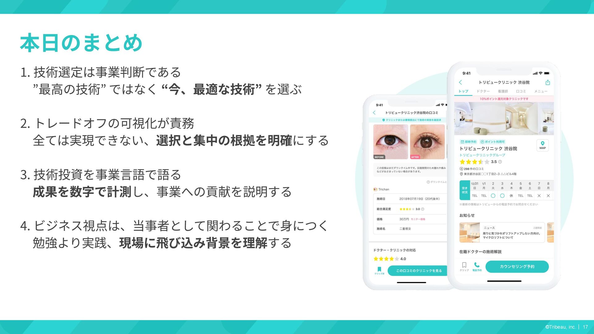 1. 技術選定は事業判断である ”最⾼の技術” ではなく “今、最適な技術” を選ぶ 2. トレードオフの可視化が責務 全ては実現できない、選択と集中の根拠を明確にする 3.