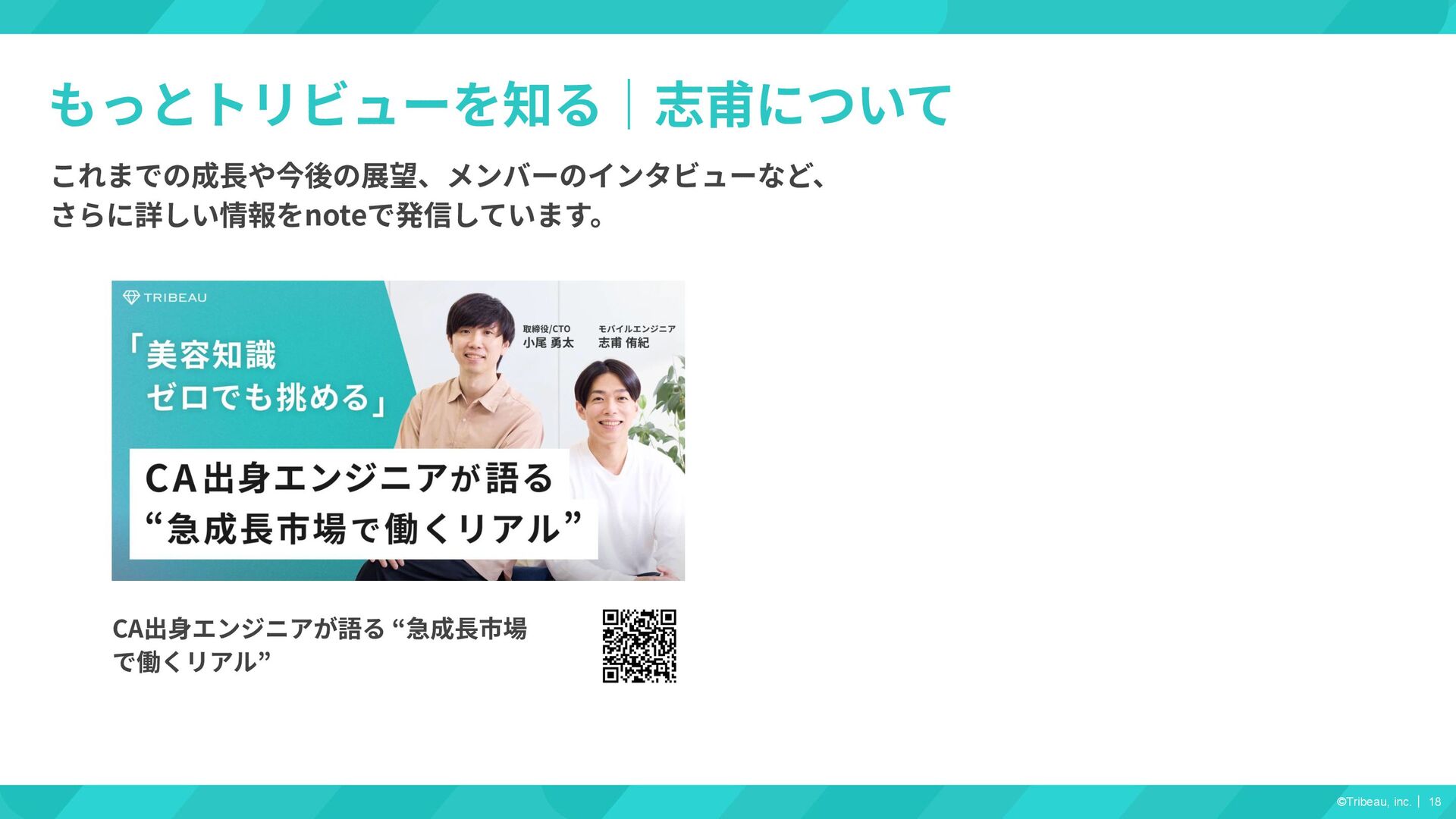 これまでの成⻑や今後の展望、メンバーのインタビューなど、 さらに詳しい情報をnoteで発信しています。 もっとトリビューを知る|志甫について ©Tribeau, inc.| 18 CA出⾝エンジニアが語る “急成⻑市場 で働くリアル”