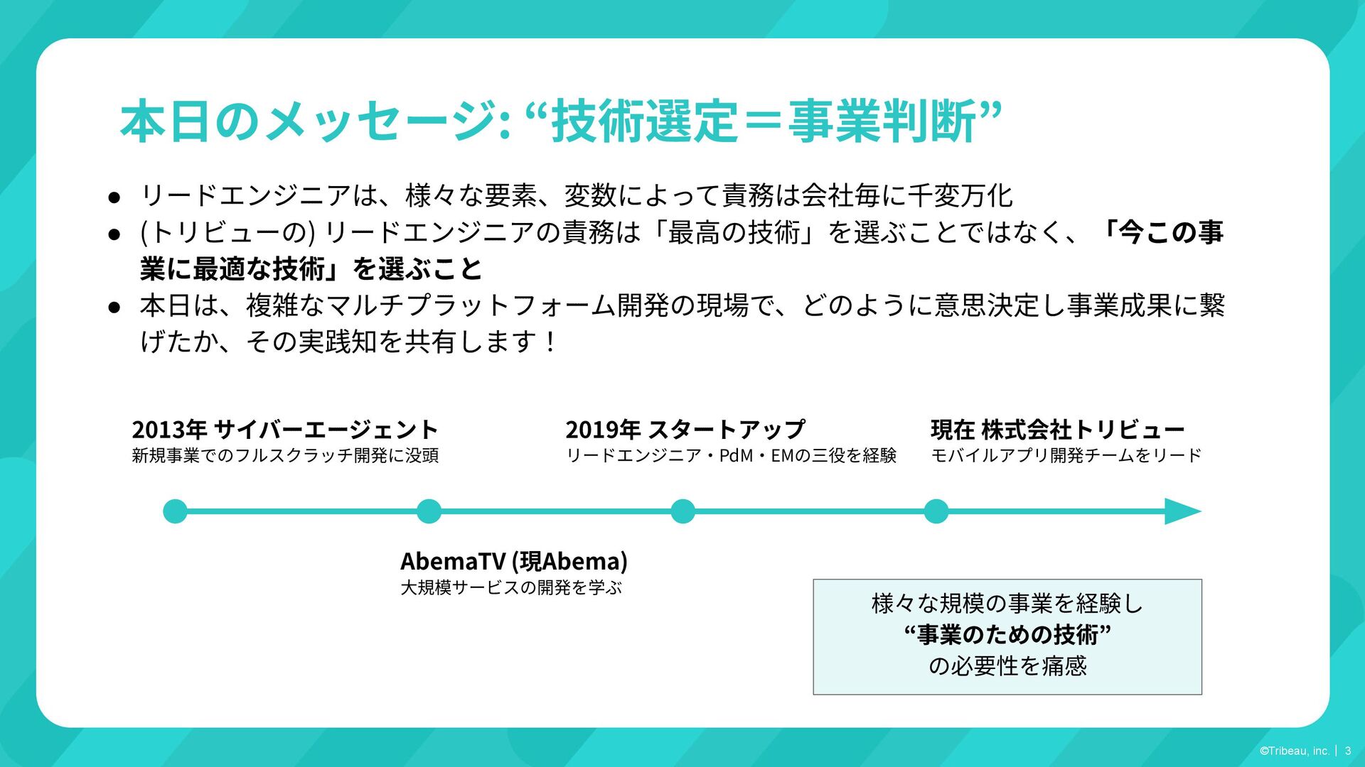 業に最適な技術」を選ぶこと • 本⽇は、複雑なマルチプラットフォーム開発の現場で、どのように意思決定し事業成果に繋 げたか、その実践知を共有します! 2013年 サイバーエージェント 新規事業でのフルスクラッチ開発に没頭 AbemaTV (現Abema) ⼤規模サービスの開発を学ぶ 2019年 スタートアップ リードエンジニア‧PdM‧EMの三役を経験 現在 株式会社トリビュー モバイルアプリ開発チームをリード 様々な規模の事業を経験し “事業のための技術” の必要性を痛感