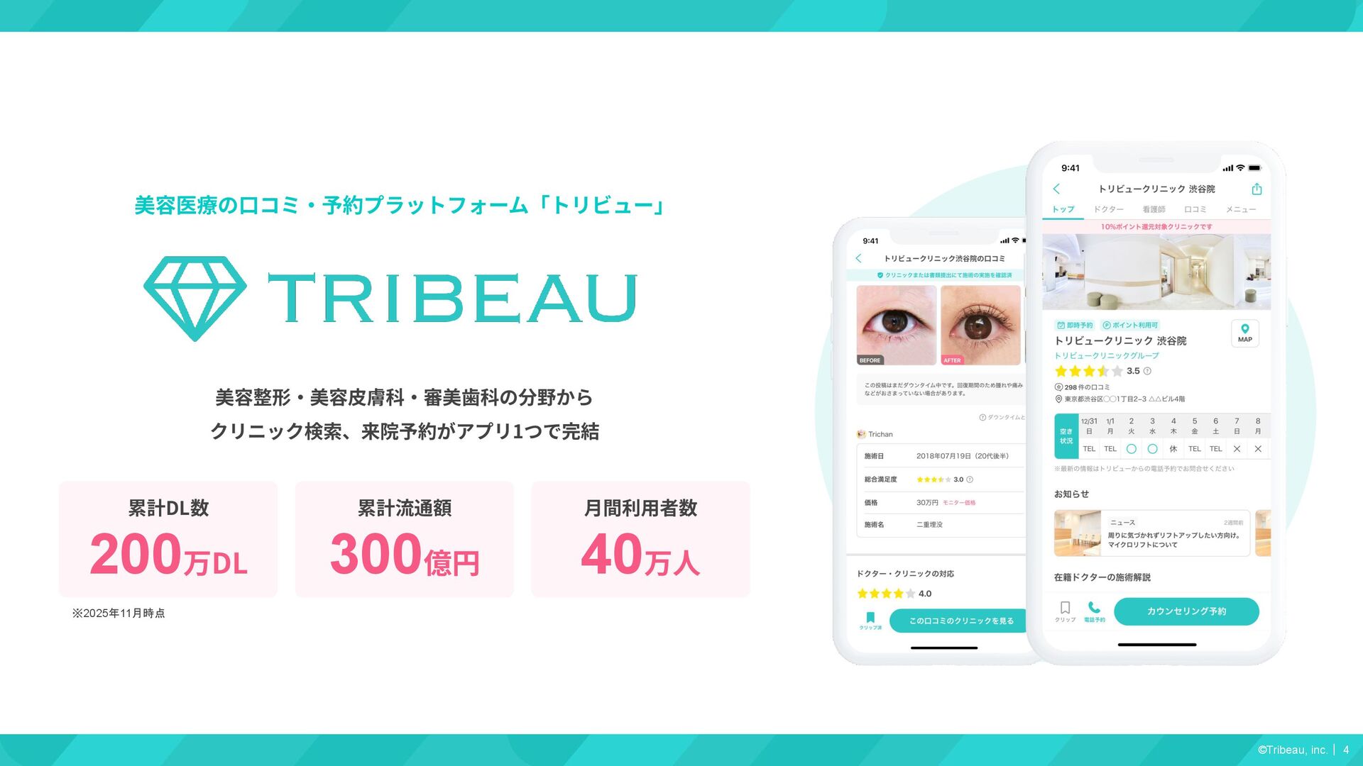 ※2025年11月時点 美容医療の⼝コミ‧予約プラットフォーム「トリビュー」 美容整形‧美容⽪膚科‧審美⻭科の分野から クリニック検索、来院予約がアプリ1つで完結 ©Tribeau, inc.| 4 累計DL数 200万DL 累計流通額