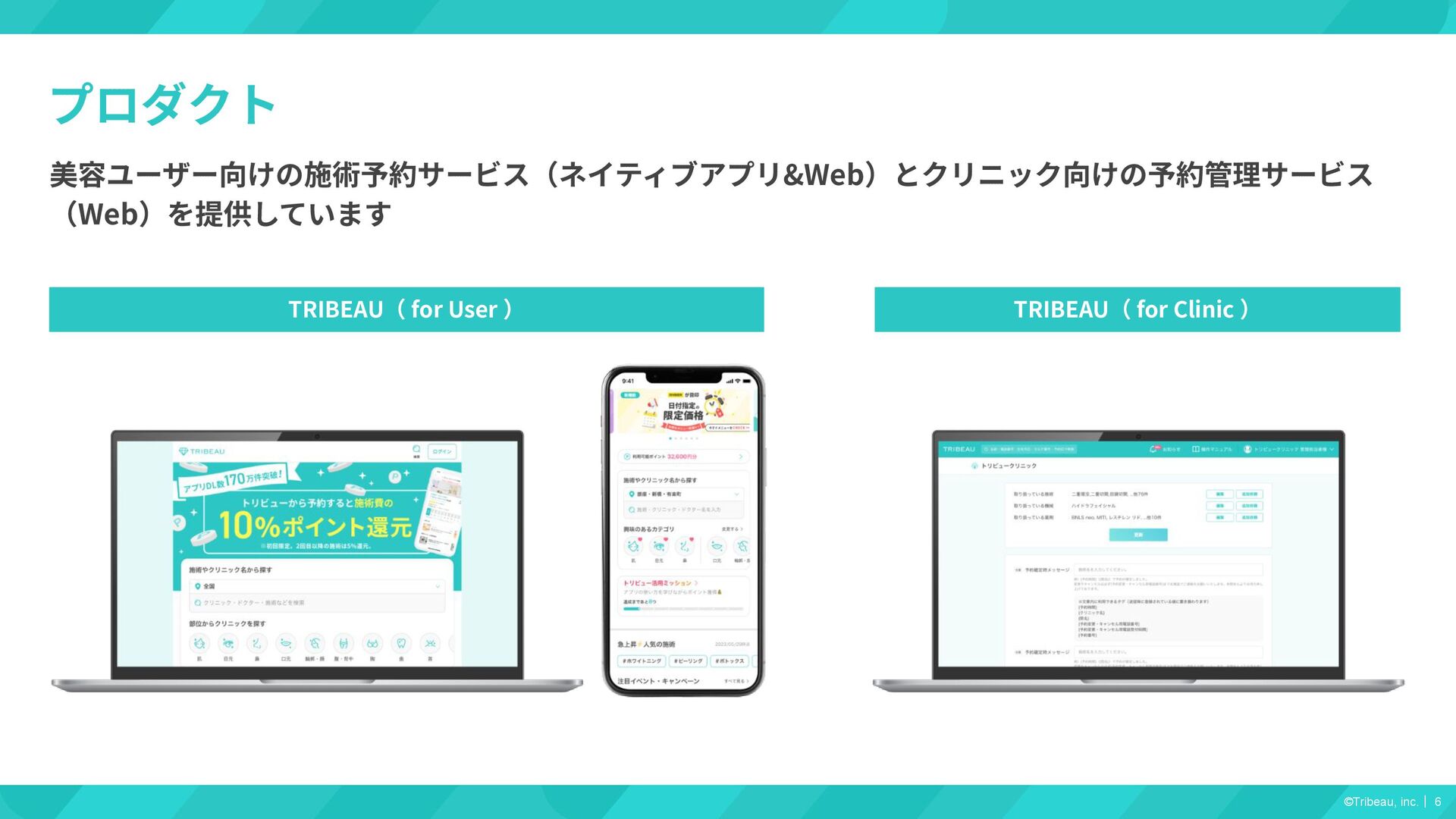 プロダクト ©Tribeau, inc.| 6 美容ユーザー向けの施術予約サービス(ネイティブアプリ&Web)とクリニック向けの予約管理サービス (Web)を提供しています TRIBEAU( for User )