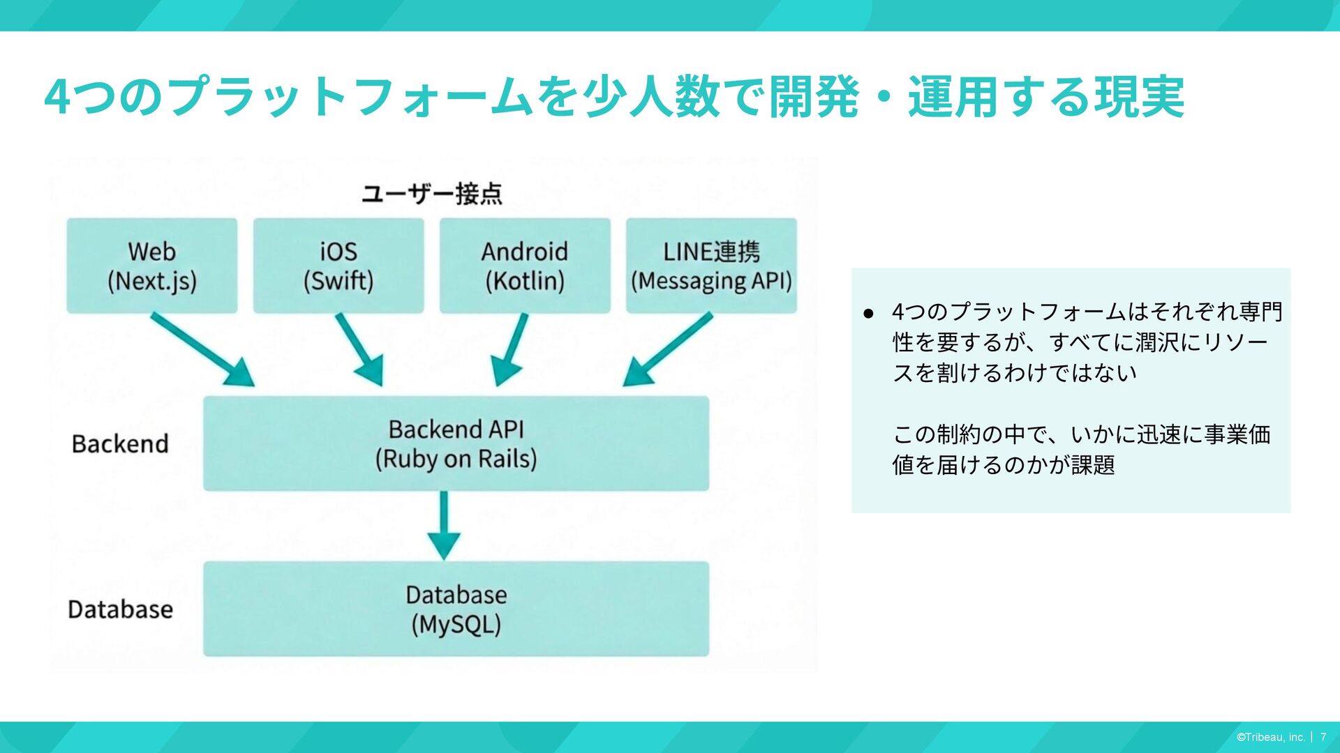 4つのプラットフォームを少⼈数で開発‧運⽤する現実 ©Tribeau, inc.| 7 • 4つのプラットフォームはそれぞれ専⾨ 性を要するが、すべてに潤沢にリソー スを割けるわけではない この制約の中で、いかに迅速に事業価 値を届けるのかが課題
