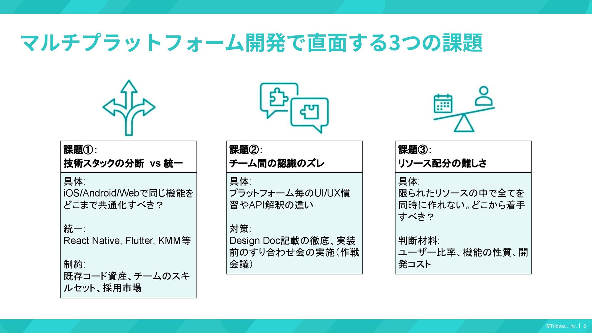 どこまで共通化すべき? 統一: React Native, Flutter, KMM等 制約: 既存コード資産、チームのスキ ルセット、採用市場 課題②: チーム間の認識のズレ 具体: プラットフォーム毎のUI/UX慣 習やAPI解釈の違い 対策: Design Doc記載の徹底、実装 前のすり合わせ会の実施(作戦 会議) 課題③: リソース配分の難しさ 具体: 限られたリソースの中で全てを 同時に作れない。どこから着手 すべき? 判断材料: ユーザー比率、機能の性質、開 発コスト