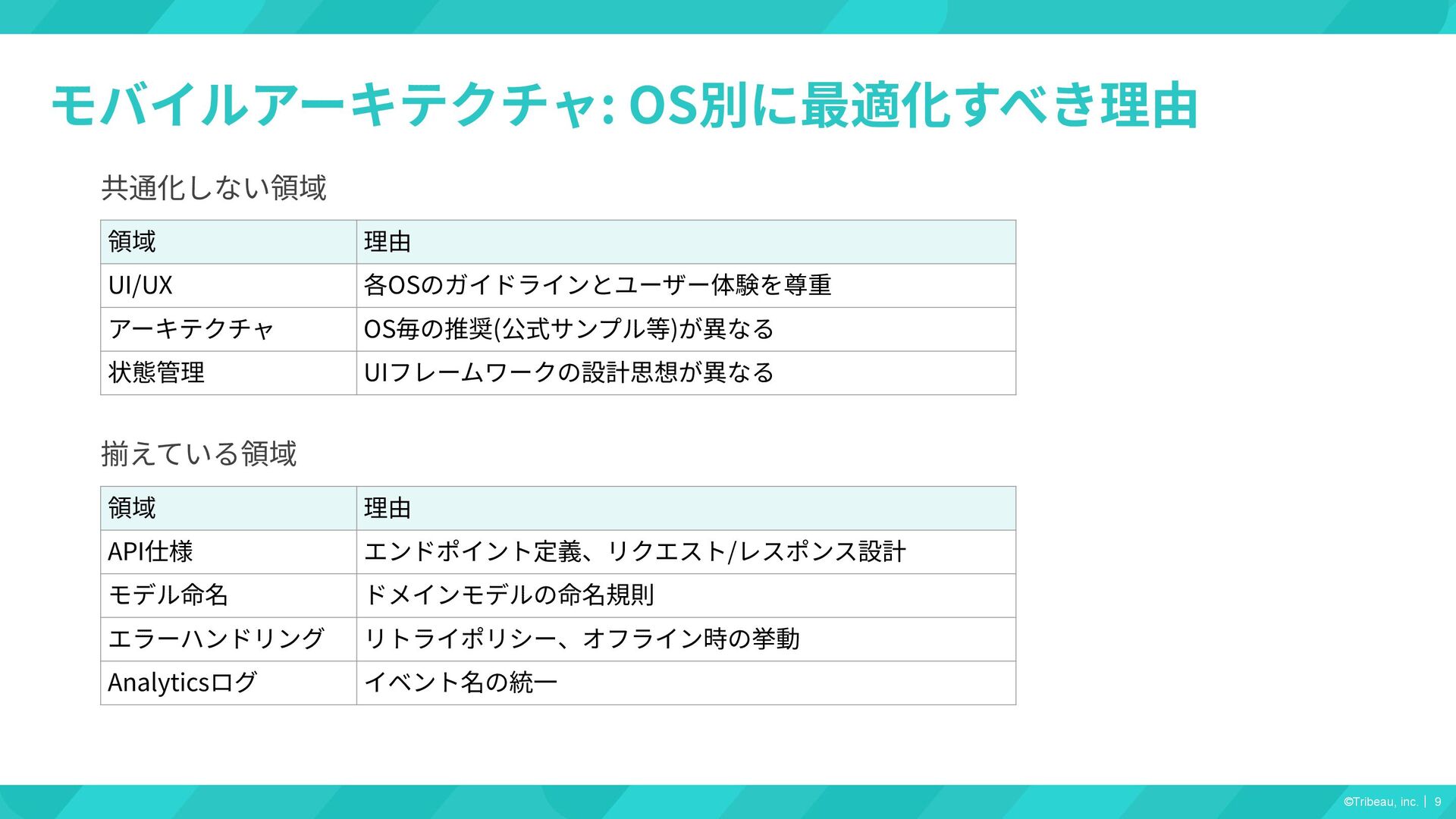 モバイルアーキテクチャ: OS別に最適化すべき理由 ©Tribeau, inc.| 9 共通化しない領域 領域 理由 API仕様 エンドポイント定義、リクエスト/レスポンス設計