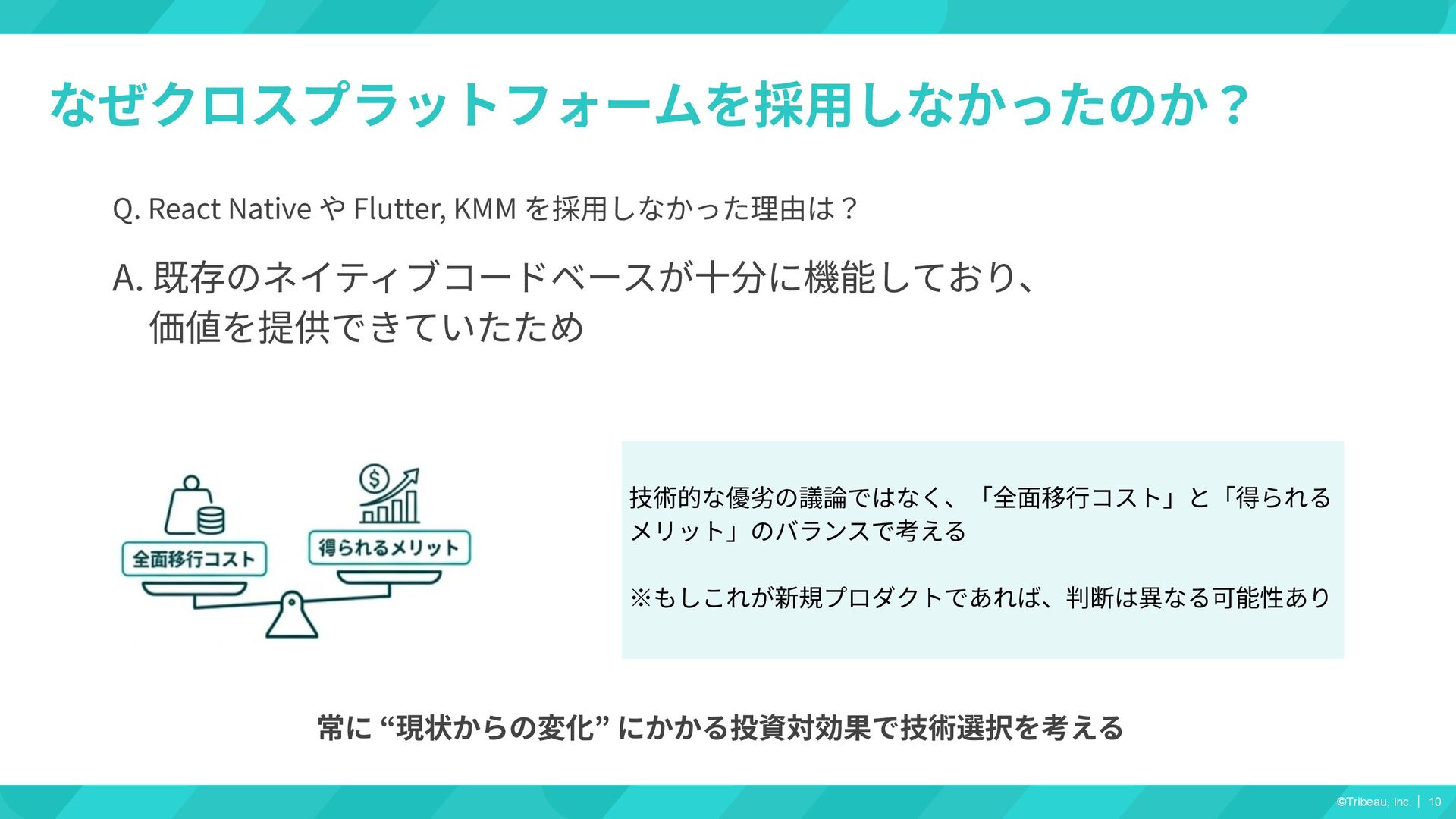 なぜクロスプラットフォームを採⽤しなかったのか? ©Tribeau, inc.| 10 Q. React Native や Flutter, KMM
