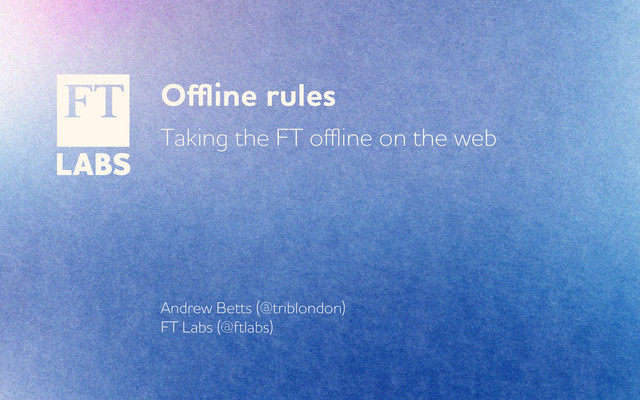 In the last couple of years a deluge of new web technologies have appeared, allowing for the creation of ever richer and more immersive web applications. The FT is one of the pioneers in the use of newly minted HTML5 technologies to build web apps that are virtually indistinguishable from native apps. But using these technologies is far from easy. I'll cover some of the compelling reasons for choosing HTML5 and investing in the web platform, with a focus on offline technologies that enable web apps to run without a network connection. The examples will feature real-life code from our FT and the Economist applications, so you know that the techniques here are applicable to large, complex problems.
