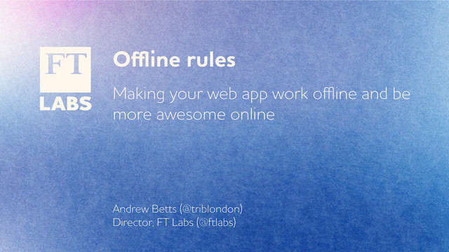 In the last couple of years a deluge of new offline storage technologies have appeared. I'll explain why they are all excellent and rubbish at the same time, why you need to use all of them, and walk through the techniques to consider when building a web application that can load and function with no network connectivity. But making use of client side storage is not just necessary to make an app that works offline - it can also hugely improve the user experience of your site when the user does have connectivity as well. The examples will feature real-life code from our FT and the Economist applications, so you know that the techniques here are applicable to large, complex problems and not just contrived examples.
