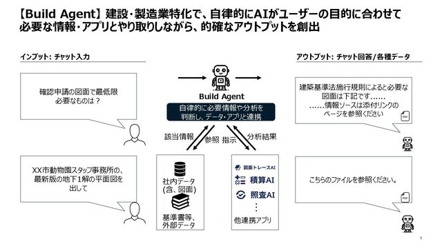 (例) 貴社 独自 データ 建築基準法/建設業法/品確 法 労働安全衛生法/労働基準法 国交省の各種基準・指針 — 河川砂防技術基準 — 道路構造令・道路運送車 両法関連, etc. 労働安全衛生マニュアル、etc. 過去の施工・設計ドキュメント 品質・安全管理資料 社内標準仕様書・積算データ 契約・法務・コンプライアンス関 連資料 技術者のナレッジ・ベテランの知 見 その他アプリ Build Agent 自律的に必要情報や分析を 判断し、データ・アプリと連携 単なるチャットボットではなく、目的に 応じて自律的にデータ/アプリと連携して、 最適な行動をAIエージェントが選択 図面検索も可能 図面の内容をAIが 構造化してDBに格納 (例: 案件名/図面の種類/施工 方法/使用資材/設計年月…)