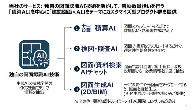 テストフィットプラン (CAD) + 積算見積書 ・・・ 積算見積書 計¥1,500,000 XXXX社御 中 株式 会社 YY YY 代表 取締役 市川 航平 チェア XXXX 15点 15 ,000円 22 5,00 0円 カテ ゴリ 資材 点数 単価 金額 YY Y 10点 10 ,000円 10 0,00 0円 ZZZ 5点 5,0 00円 25 ,000円 デス ク AAA 15点 10 ,000円 15 0,00 0円 BBB 5点 2,0 00円 10 ,000円 CCC 1点 50 ,000円 50 ,000円 ・・・・ 50人利用 個室21 会議室6 …… 50人利用 個室11 会議室6 ……. 積算見積書 計¥1,500,000 XXXX社御 中 株式 会社 YY YY 代表 取締役 市川 航平 チェア XXXX 15点 15 ,000円 22 5,00 0円 カテ ゴリ 資材 点数 単価 金額 YY Y 10点 10 ,000円 10 0,00 0円 ZZZ 5点 5,0 00円 25 ,000円 デス ク AAA 15点 10 ,000円 15 0,00 0円 BBB 5点 2,0 00円 10 ,000円 CCC 1点 50 ,000円 50 ,000円 ・・・・ • 避難安全 検証 • 消防局の 法令 • ….. 個別設定条件 法令要件 元図面 (紙/PDF/CAD) 50人利用 個室3個 会議室6個 …… 積算見積書 計¥1,500,000 XXXX社御 中 株式 会社 YY YY 代表 取締役 市川 航平 チェア XXXX 15点 15 ,000円 22 5,00 0円 カテ ゴリ 資材 点数 単価 金額 YY Y 10点 10 ,000円 10 0,00 0円 ZZZ 5点 5,0 00円 25 ,000円 デス ク AAA 15点 10 ,000円 15 0,00 0円 BBB 5点 2,0 00円 10 ,000円 CCC 1点 50 ,000円 50 ,000円 ・・・・ ・・・ ・・・ 4 オフィスレイアウトの2D図面生成の例