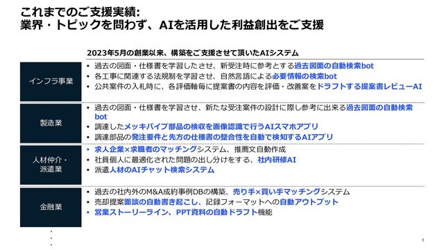 売却提案面談の自動書き起こし、記録フォーマットへの自動アウトプット 営業ストーリーライン、PPT資料の自動ドラフト機能 人材仲介・ 派遣業 求人企業×求職者のマッチングシステム、推薦文自動作成 社員個人に最適化された問題の出し分けをする、社内研修AI 派遣人材のAIチャット検索システム 過去の図面・仕様書を学習させ、新たな受注案件の設計に際し参考に出来る過去図面の自動検索 bot 調達したメッキパイプ部品の検収を画像認識で行うAIスマホアプリ 調達部品の発注要件と先方の仕様書の整合性を自動で検知するAIアプリ 製造業 ・ ・ ・ インフラ事業 過去の図面・仕様書を学習したさせ、新受注時に参考とする過去図面の自動検索bot 各工事に関連する法規制を学習させ、自然言語による必要情報の検索bot 公共案件の入札時に、各評価軸毎に提案書の内容を評価・改善案をドラフトする提案書レビューAI