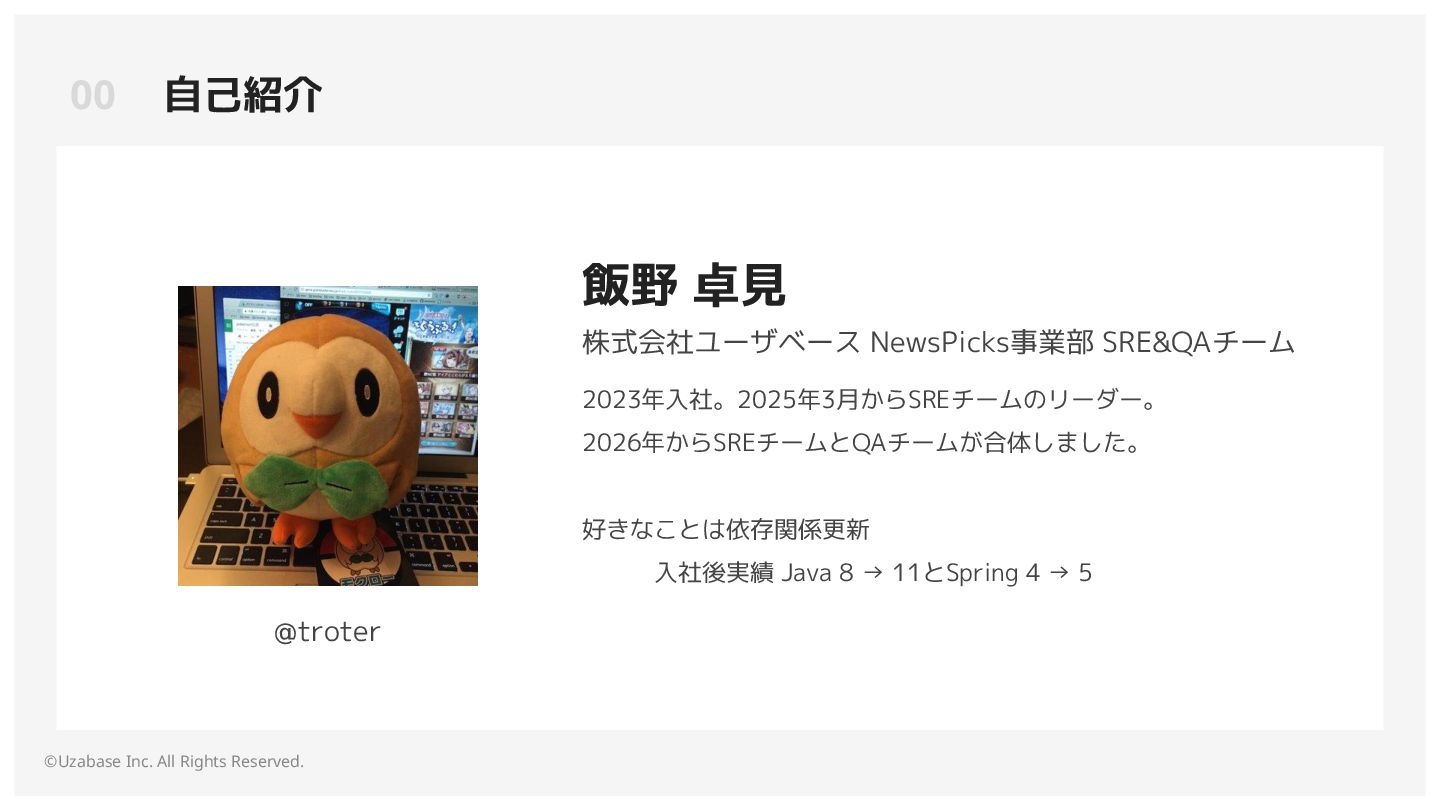 NewsPicks事業部 SRE&QAチーム 2023年入社。2025年3月からSREチームのリーダー。 2026年からSREチームとQAチームが合体しました。 好きなことは依存関係更新 入社後実績 Java 8 → 11とSpring 4 → 5 @troter