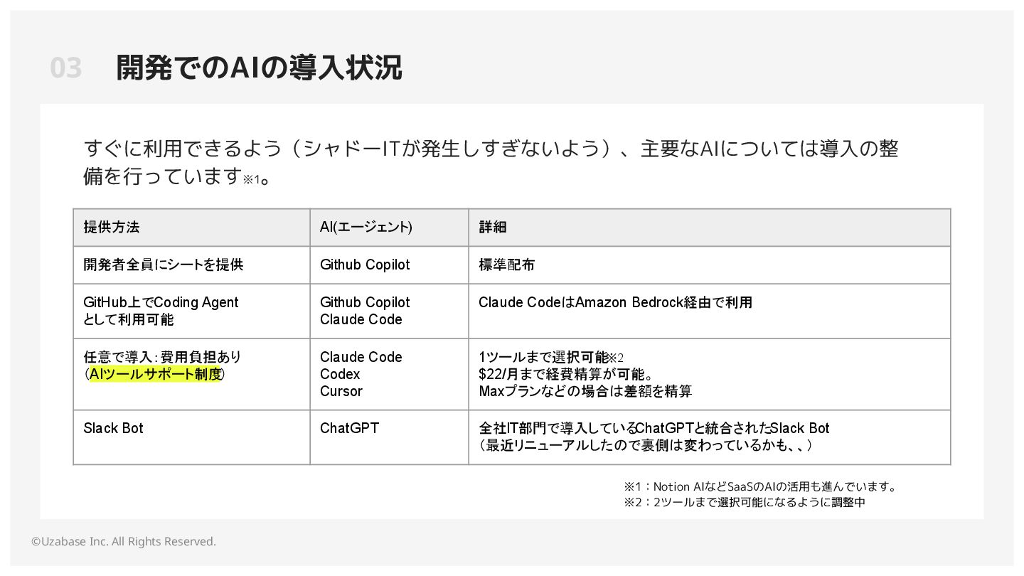 開発者全員にシートを提供 Github Copilot 標準配布 GitHub上でCoding Agent として利用可能 Github Copilot Claude Code Claude CodeはAmazon Bedrock経由で利用 任意で導入:費用負担あり (AIツールサポート制度 ) Claude Code Codex Cursor 1ツールまで選択可能 ※2 $22/月まで経費精算が可能。 Maxプランなどの場合は差額を精算 Slack Bot ChatGPT 全社IT部門で導入している ChatGPTと統合されたSlack Bot (最近リニューアルしたので裏側は変わっているかも、、) すぐに利用できるよう(シャドーITが発生しすぎないよう)、主要なAIについては導入の整 備を行っています※1 。 ※1:Notion AIなどSaaSのAIの活用も進んでいます。 ※2:2ツールまで選択可能になるように調整中