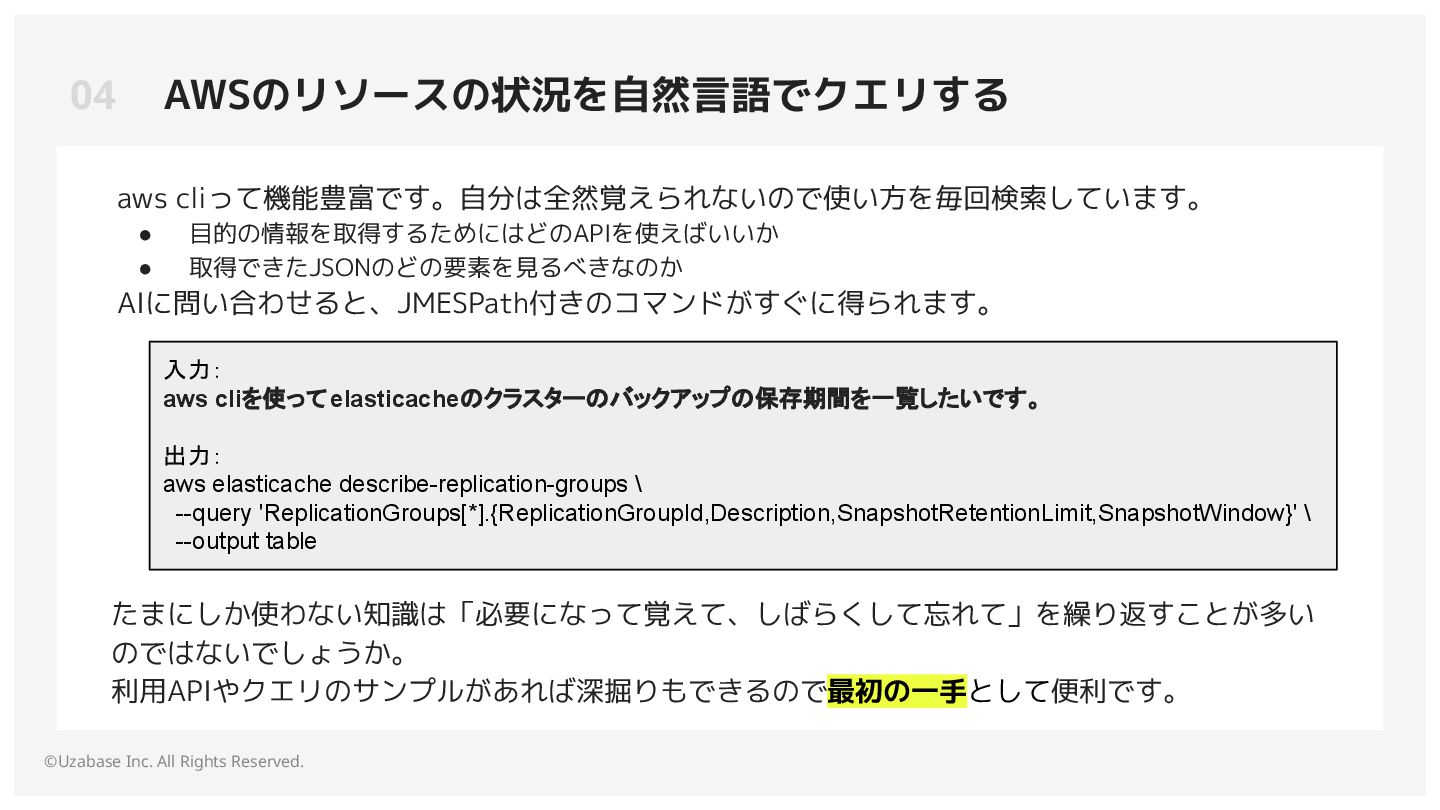 目的の情報を取得するためにはどのAPIを使えばいいか • 取得できたJSONのどの要素を見るべきなのか AIに問い合わせると、JMESPath付きのコマンドがすぐに得られます。 入力: aws cliを使ってelasticacheのクラスターのバックアップの保存期間を一覧したいです。 出力: aws elasticache describe-replication-groups \ --query 'ReplicationGroups[*].{ReplicationGroupId,Description,SnapshotRetentionLimit,SnapshotWindow}' \ --output table たまにしか使わない知識は「必要になって覚えて、しばらくして忘れて」を繰り返すことが多い のではないでしょうか。 利用APIやクエリのサンプルがあれば深掘りもできるので最初の一手として便利です。