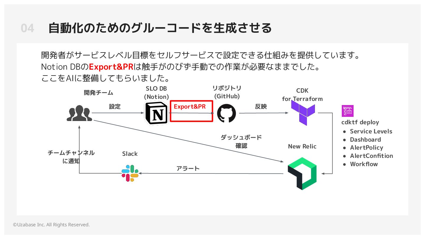ここをAIに整備してもらいました。 リポジトリ (GitHub) CDK for Terraform New Relic アラート チームチャンネル に通知 ダッシュボード 確認 反映 Slack 開発チーム 設定 cdktf deploy • Service Levels • Dashboard • AlertPolicy • AlertConfition • Workflow SLO DB (Notion) Export&PR