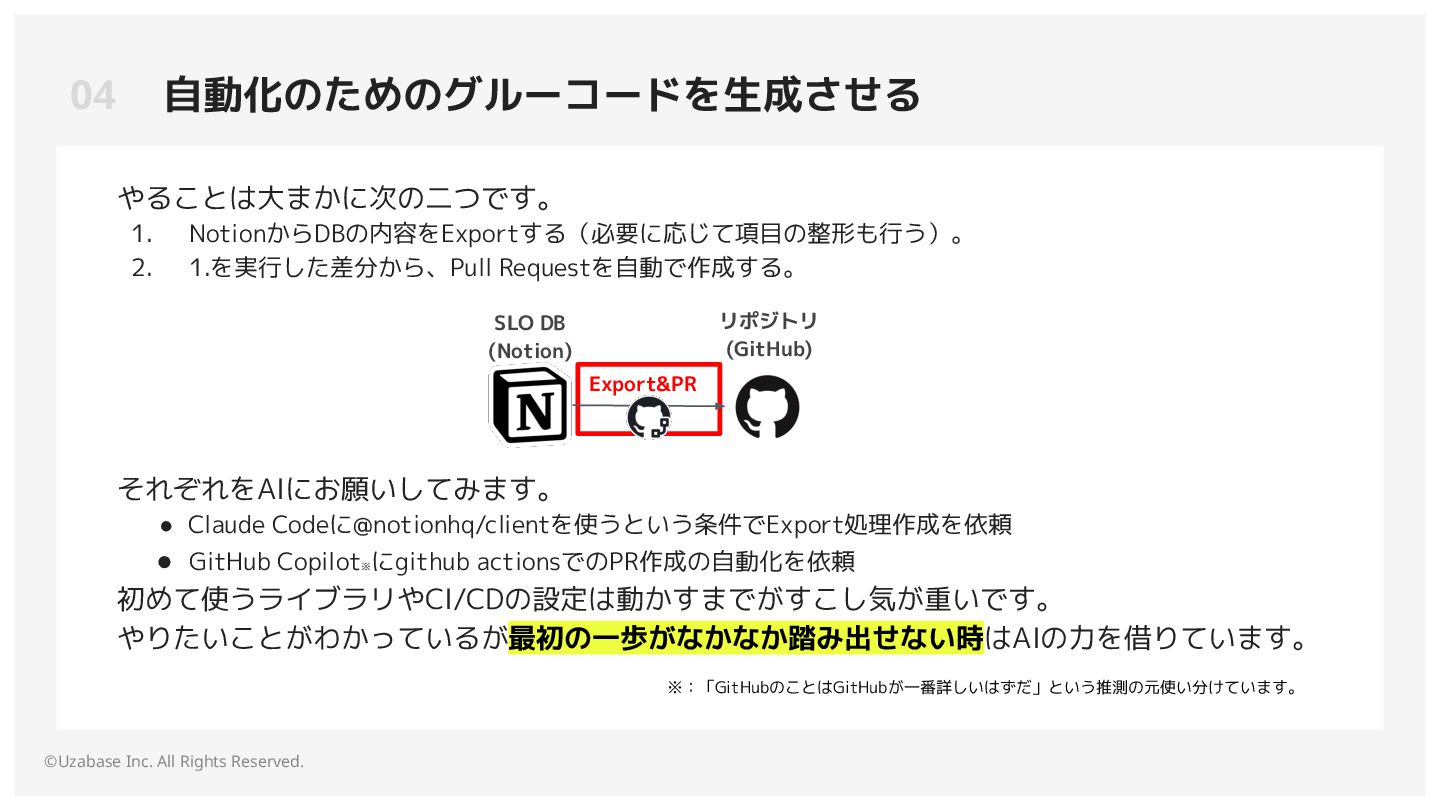 開発者がサービスレベル目標をセルフサービスで設定できる仕組みを提供しています。 Notion DBのExport&PRは触手がのびず手動での作業が必要なままでした。
