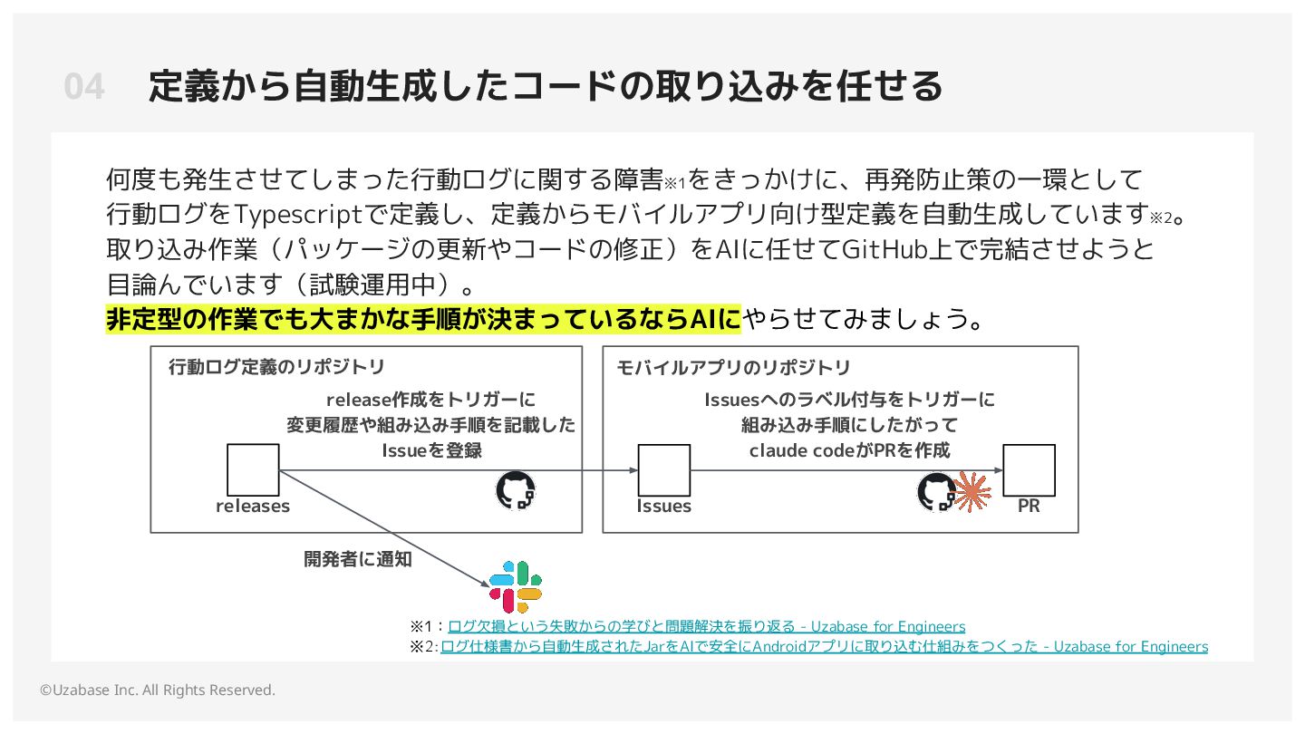 。 取り込み作業(パッケージの更新やコードの修正)をAIに任せてGitHub上で完結させようと 目論んでいます(試験運用中)。 非定型の作業でも大まかな手順が決まっているならAIにやらせてみましょう。 行動ログ定義のリポジトリ Issuesへのラベル付与をトリガーに 組み込み手順にしたがって claude codeがPRを作成 releases Issues release作成をトリガーに 変更履歴や組み込み手順を記載した Issueを登録 PR モバイルアプリのリポジトリ 開発者に通知 ※1:ログ欠損という失敗からの学びと問題解決を振り返る - Uzabase for Engineers ※2:ログ仕様書から自動生成されたJarをAIで安全にAndroidアプリに取り込む仕組みをつくった - Uzabase for Engineers