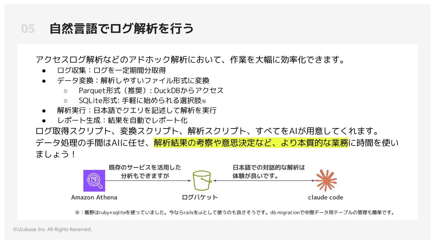 • データ変換:解析しやすいファイル形式に変換 ◦ Parquet形式(推奨): DuckDBからアクセス ◦ SQLite形式: 手軽に始められる選択肢※ • 解析実行:日本語でクエリを記述して解析を実行 • レポート生成:結果を自動でレポート化 ログ取得スクリプト、変換スクリプト、解析スクリプト、すべてをAIが用意してくれます。 データ処理の手間はAIに任せ、解析結果の考察や意思決定など、より本質的な業務に時間を使い ましょう! Amazon Athena ログバケット 既存のサービスを活用した 分析もできますが 日本語での対話的な解析は 体験が良いです。 claude code ※:飯野はruby+sqliteを使っていました。今ならrailsをuiとして使うのも良さそうです。db migrationで中間データ用テーブルの管理も簡単です。