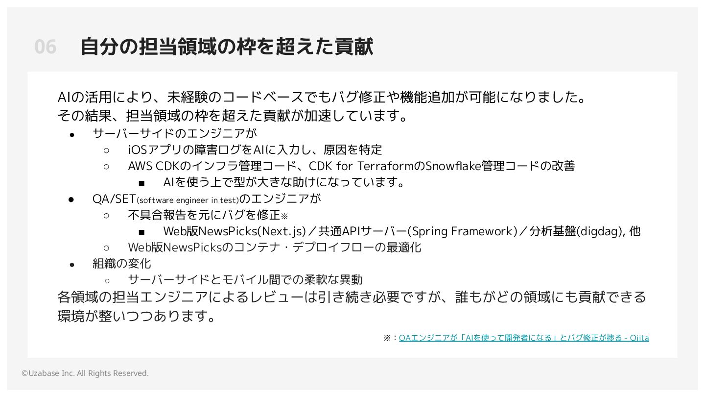 サーバーサイドのエンジニアが ◦ iOSアプリの障害ログをAIに入力し、原因を特定 ◦ AWS CDKのインフラ管理コード、CDK for TerraformのSnowflake管理コードの改善 ▪ AIを使う上で型が大きな助けになっています。 • QA/SET(software engineer in test)のエンジニアが ◦ 不具合報告を元にバグを修正※ ▪ Web版NewsPicks(Next.js)/共通APIサーバー(Spring Framework)/分析基盤(digdag), 他 ◦ Web版NewsPicksのコンテナ・デプロイフローの最適化 • 組織の変化 ◦ サーバーサイドとモバイル間での柔軟な異動 各領域の担当エンジニアによるレビューは引き続き必要ですが、誰もがどの領域にも貢献できる 環境が整いつつあります。 ※:QAエンジニアが「AIを使って開発者になる」とバグ修正が捗る - Qiita