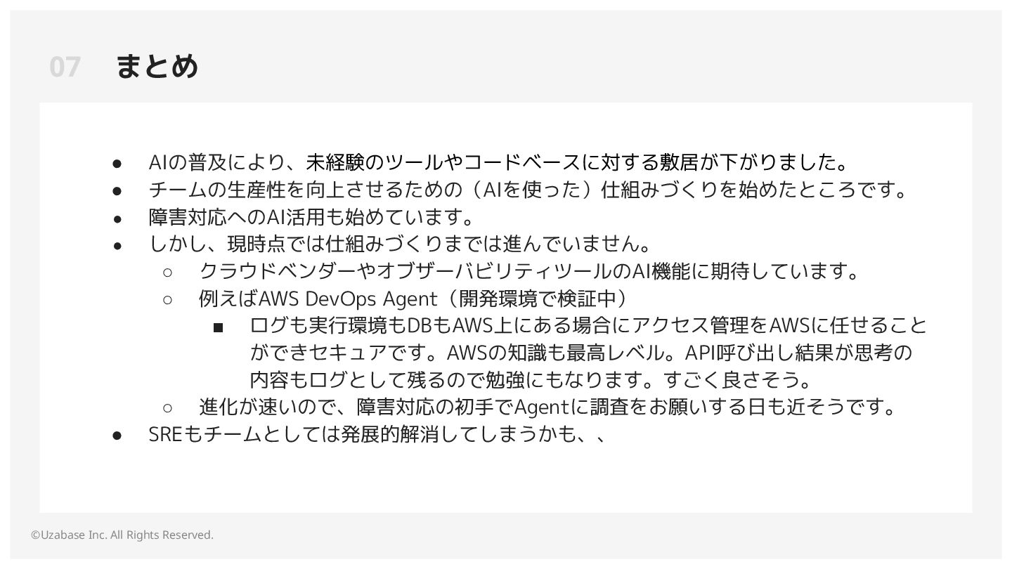 チームの生産性を向上させるための(AIを使った)仕組みづくりを始めたところです。 • 障害対応へのAI活用も始めています。 • しかし、現時点では仕組みづくりまでは進んでいません。 ◦ クラウドベンダーやオブザーバビリティツールのAI機能に期待しています。 ◦ 例えばAWS DevOps Agent(開発環境で検証中) ▪ ログも実行環境もDBもAWS上にある場合にアクセス管理をAWSに任せること ができセキュアです。AWSの知識も最高レベル。API呼び出し結果が思考の 内容もログとして残るので勉強にもなります。すごく良さそう。 ◦ 進化が速いので、障害対応の初手でAgentに調査をお願いする日も近そうです。 • SREもチームとしては発展的解消してしまうかも、、