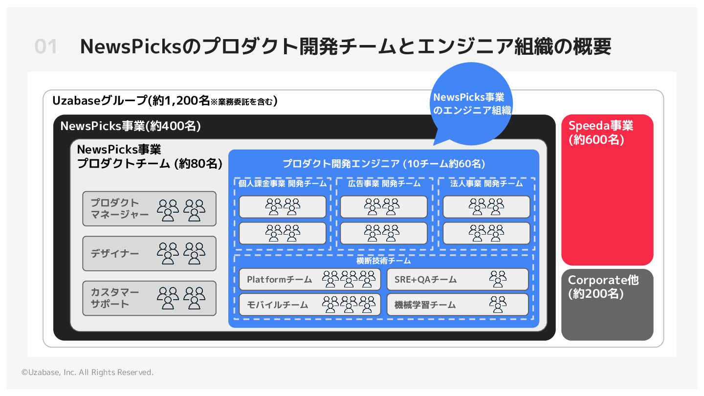 2. ©Uzabase, Inc. All Rights Reserved. 01 NewsPicksのプロダクト開発チームとエンジニア組織の概要 Uzabaseグループ(約1,200名※業務委託を含む) NewsPicks事業(約400名) NewsPicks事業