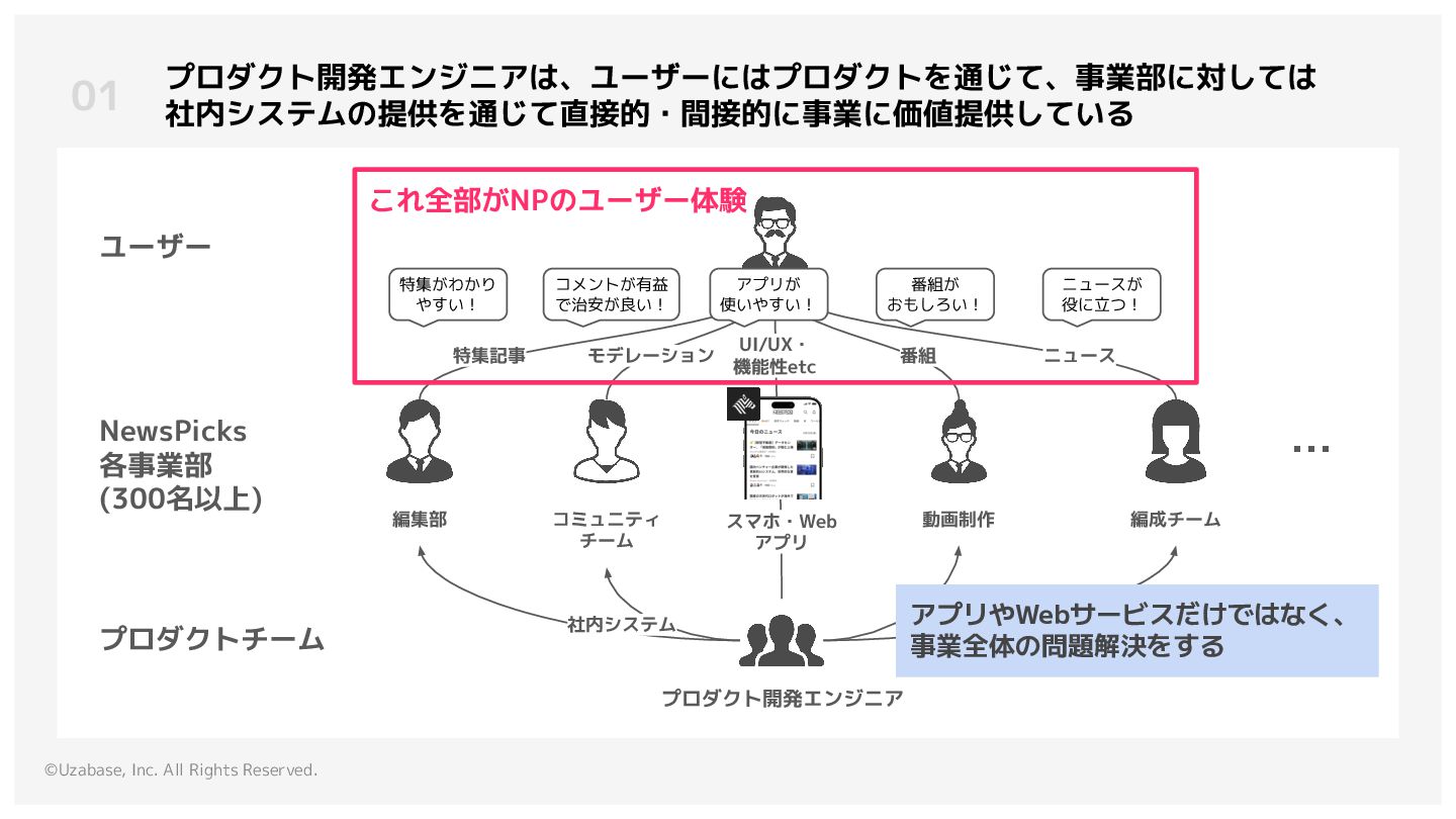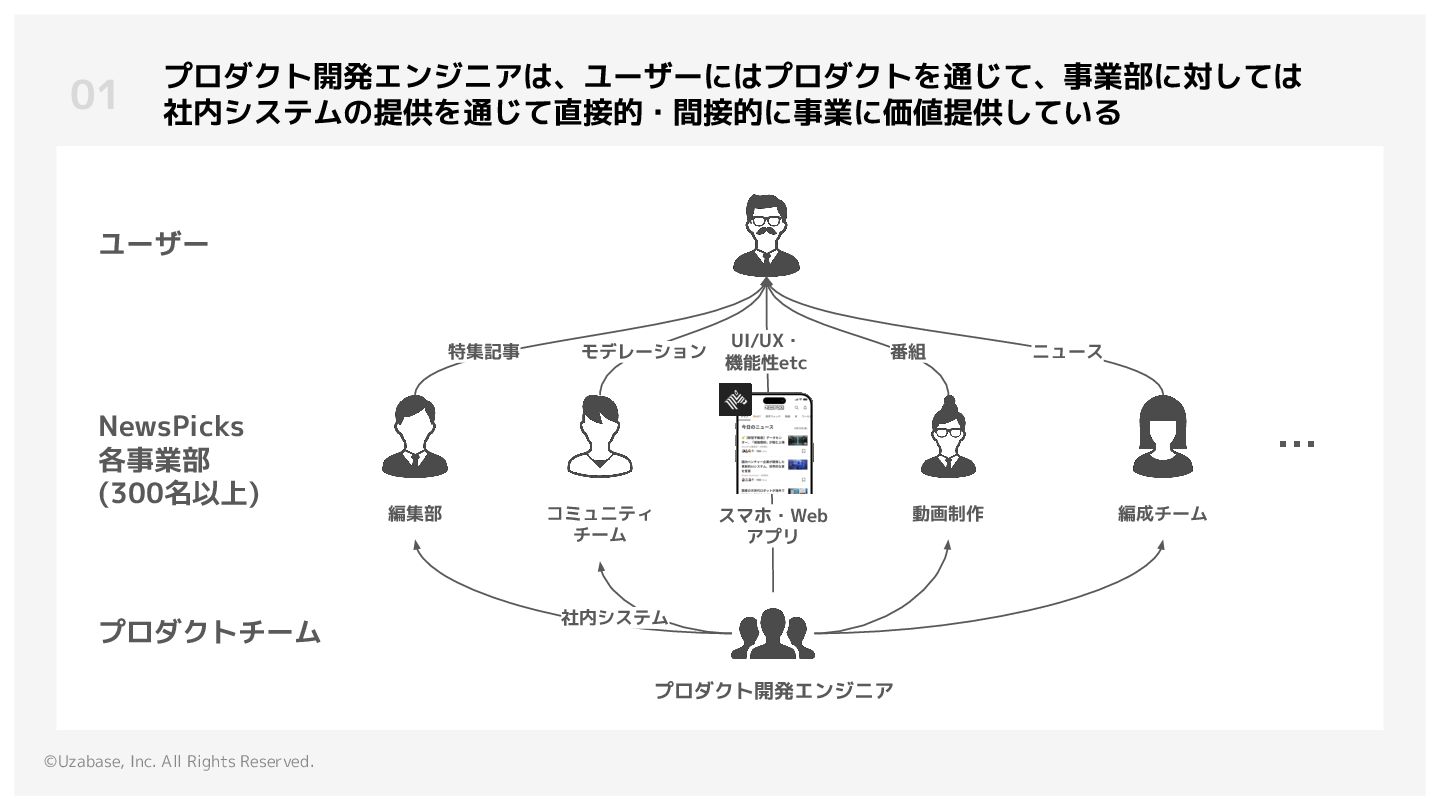 3. ©Uzabase, Inc. All Rights Reserved. 01 プロダクト開発エンジニアは、ユーザーにはプロダクトを通じて、事業部に対しては 社内システムの提供を通じて直接的・間接的に事業に価値提供している プロダクトチーム ユーザー