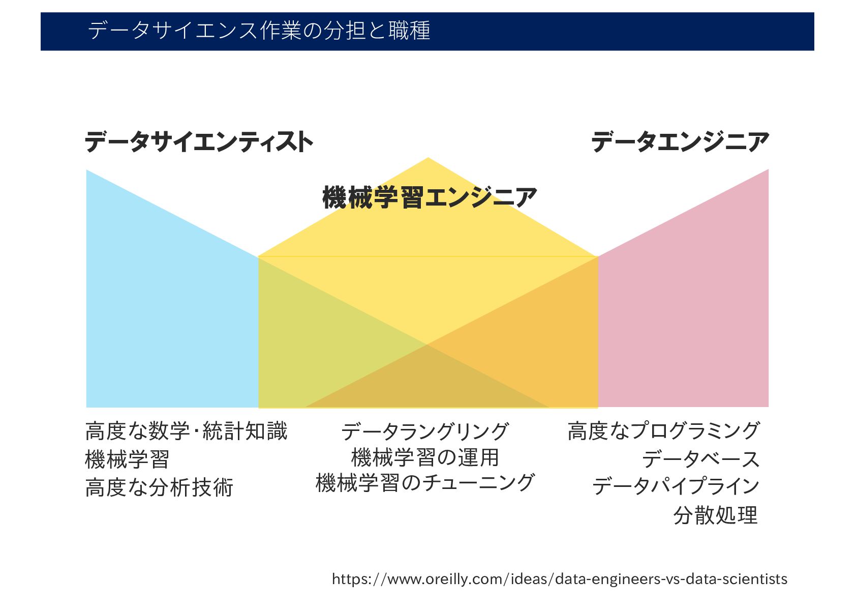 データサイエンス作業の分担と職種 https://www.oreilly.com/ideas/data-engineers-vs-data-scientists データサイエンティスト データエンジニア 高度な数学・統計知識 機械学習 高度な分析技術 高度なプログラミング データベース データパイプライン