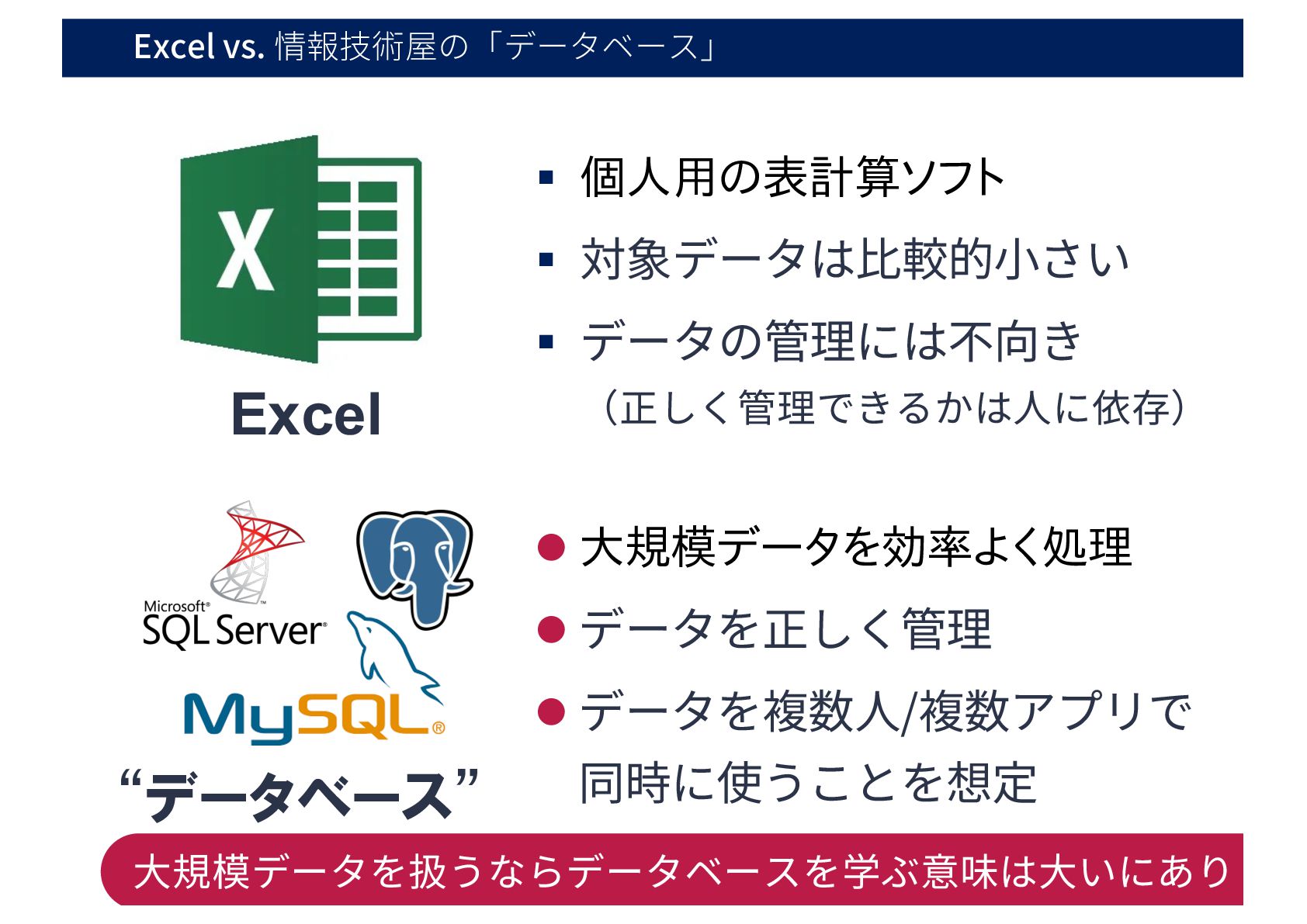 Excel vs. 情報技術屋の「データベース」 Excel § 個人用の表計算ソフト § 対象データは⽐較的⼩さい § データの管理には不向き