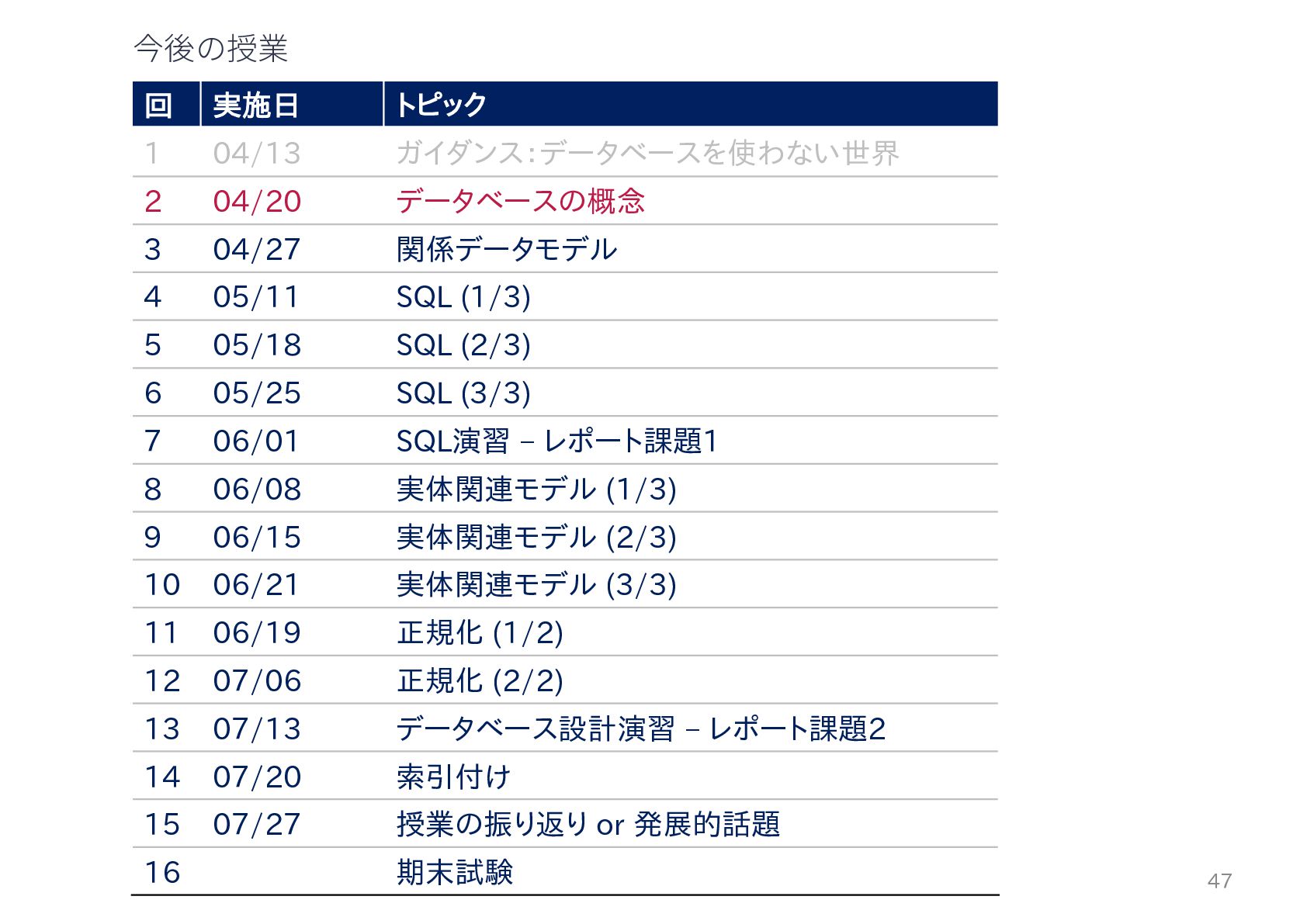 回 実施日 トピック 1 04/13 ガイダンス:データベースを使わない世界 2 04/20 データベースの概念 3
