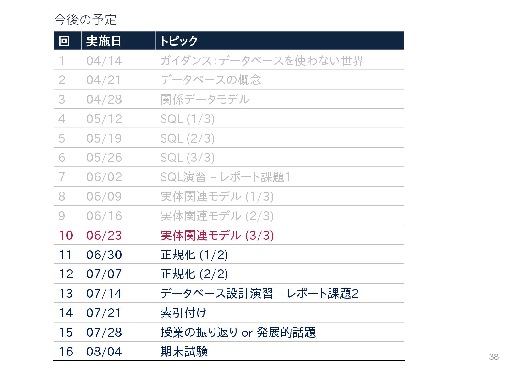04/28 関係データモデル 4 05/12 SQL (1/3) 5 05/19 SQL (2/3) 6 05/26 SQL (3/3) 7 06/02 SQL演習 – レポート課題1 8 06/09 実体関連モデル (1/3) 9 06/16 実体関連モデル (2/3) 10 06/23 実体関連モデル (3/3) 11 06/30 正規化 (1/2) 12 07/07 正規化 (2/2) 13 07/14 データベース設計演習 – レポート課題2 14 07/21 索引付け 15 07/28 授業の振り返り or 発展的話題 16 08/04 期末試験 今後の予定 38