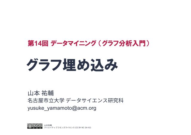 Grover, J. Leskovec. ACM SIGKDD International Conference on Knowledge Discovery and Data Mining (KDD), 2016. p=1, q=0.5の設定 (深さ優先探索重視) p=1, q=2の設定 (幅優先探索重視) node2vecで得たノード埋め込みに対して K-meansを適⽤した結果 良い表現を得るにはパラメータ設定がシビア…
