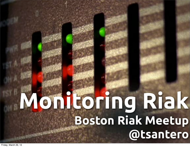 A brief talk covering the basics of monitoring a Riak cluster. Delivered at the Boston Riak Meetup, inspired by Monitorama. I'm sorry for all the Wire references (not really).
