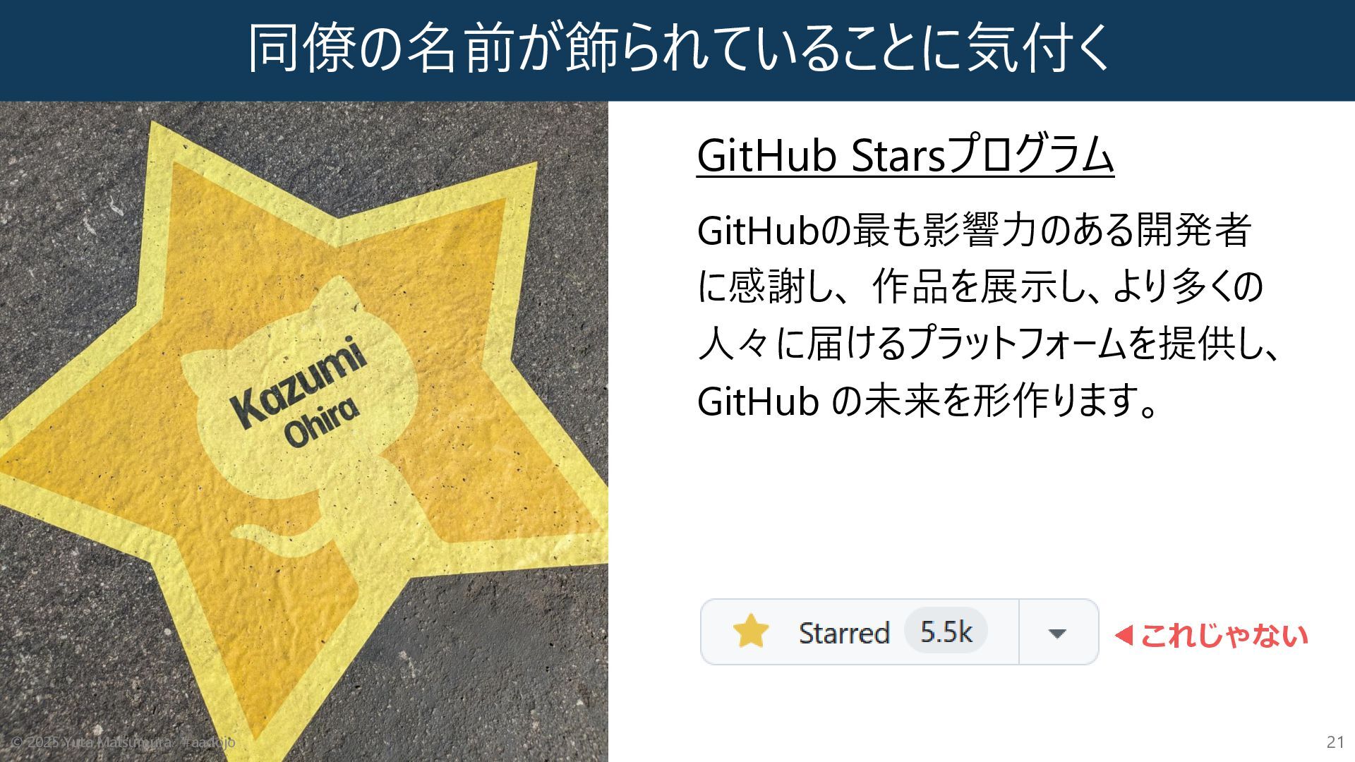 同僚の名前が飾られていることに気付く GitHub Starsプログラム GitHubの最も影響力のある開発者 に感謝し、 作品を展示し、より多くの 人々に届けるプラットフォームを提供し、 GitHub の未来を形作ります。 ©