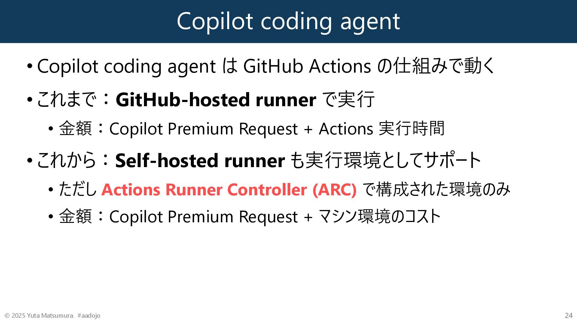の仕組みで動く • これまで:GitHub-hosted runner で実行 • 金額:Copilot Premium Request + Actions 実行時間 • これから:Self-hosted runner も実行環境としてサポート • ただし Actions Runner Controller (ARC) で構成された環境のみ • 金額:Copilot Premium Request + マシン環境のコスト © 2025 Yuta Matsumura. #aadojo 24