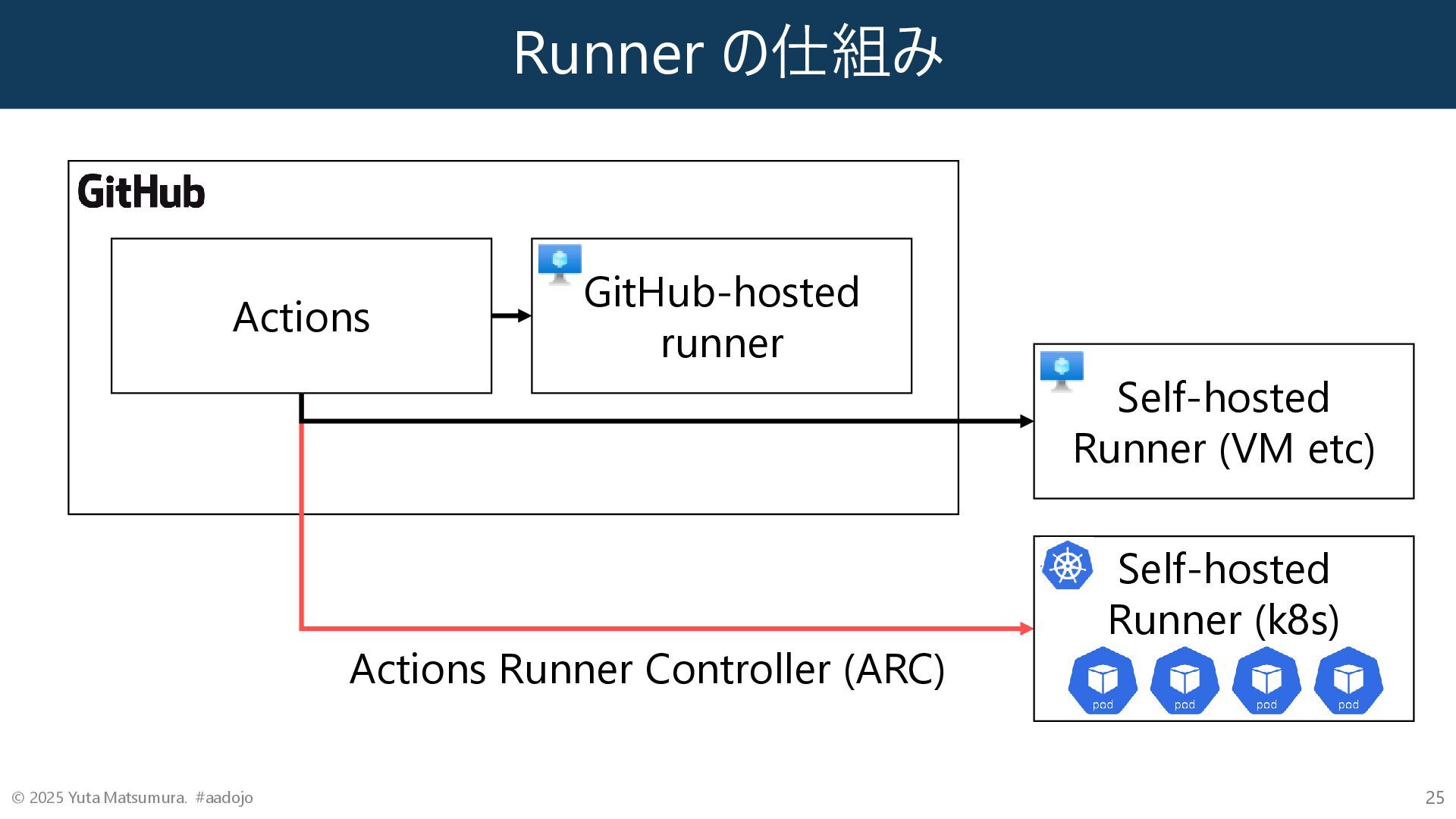 Runner の仕組み © 2025 Yuta Matsumura. #aadojo 25 Actions GitHub-hosted