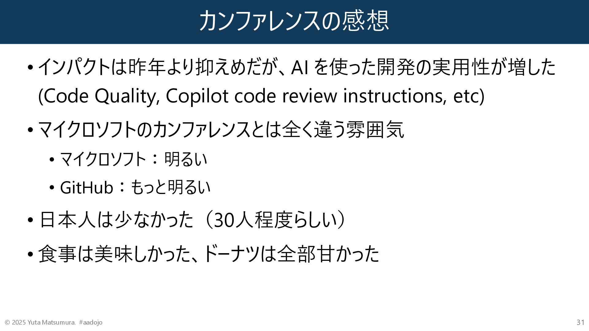 etc) • マイクロソフトのカンファレンスとは全く違う雰囲気 • マイクロソフト:明るい • GitHub:もっと明るい • 日本人は少なかった(30人程度らしい) • 食事は美味しかった、ドーナツは全部甘かった © 2025 Yuta Matsumura. #aadojo 31