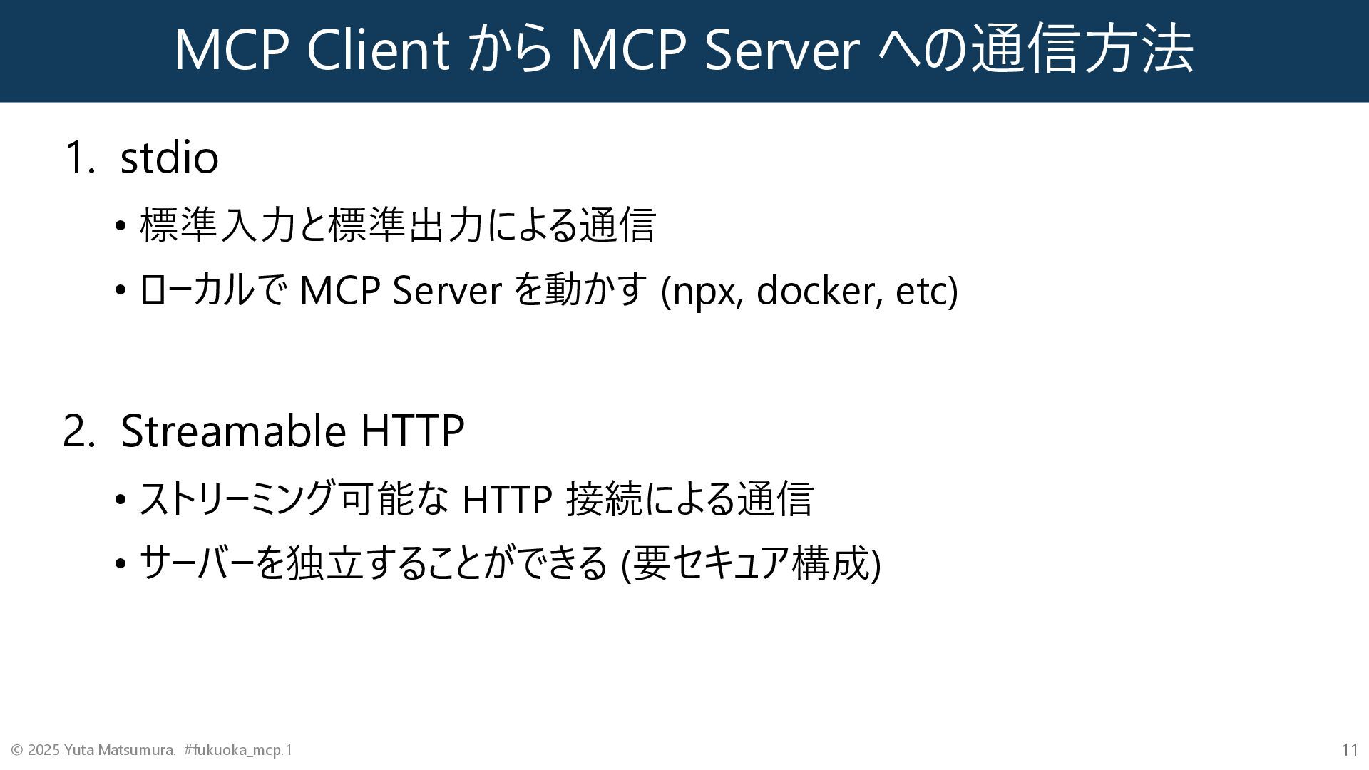 • ローカルで MCP Server を動かす (npx, docker, etc) 2. Streamable HTTP • ストリーミング可能な HTTP 接続による通信 • サーバーを独立することができる (要セキュア構成) © 2025 Yuta Matsumura. #fukuoka_mcp.1 11