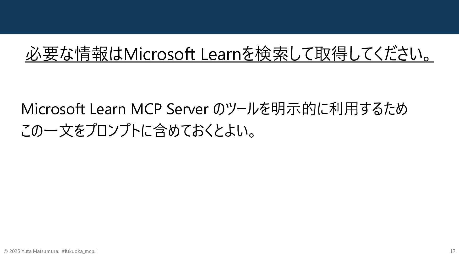 必要な情報はMicrosoft Learnを検索して取得してください。 Microsoft Learn MCP Server のツールを明示的に利用するため この一文をプロンプトに含めておくとよい。 © 2025