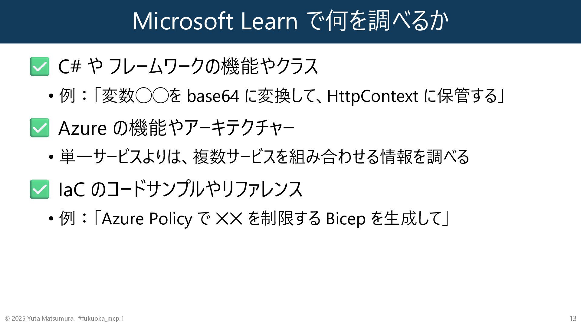 に保管する」 Azure の機能やアーキテクチャー • 単一サービスよりは、複数サービスを組み合わせる情報を調べる IaC のコードサンプルやリファレンス • 例:「Azure Policy で ✕✕ を制限する Bicep を生成して」 © 2025 Yuta Matsumura. #fukuoka_mcp.1 13