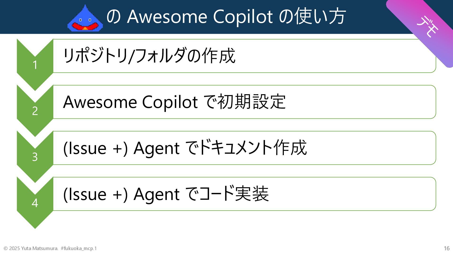 3 (Issue +) Agent でドキュメント作成 4 (Issue +) Agent でコード実装 © 2025 Yuta Matsumura. #fukuoka_mcp.1 16